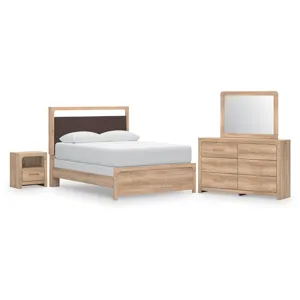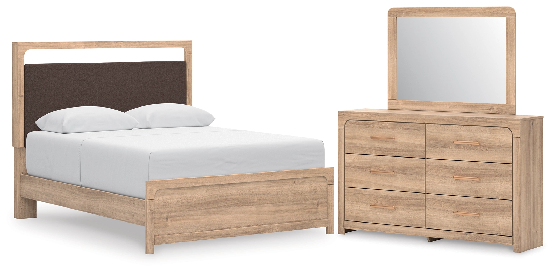 Kinlanni Queen Upholstered Panel Bed, Dresser and Mirror