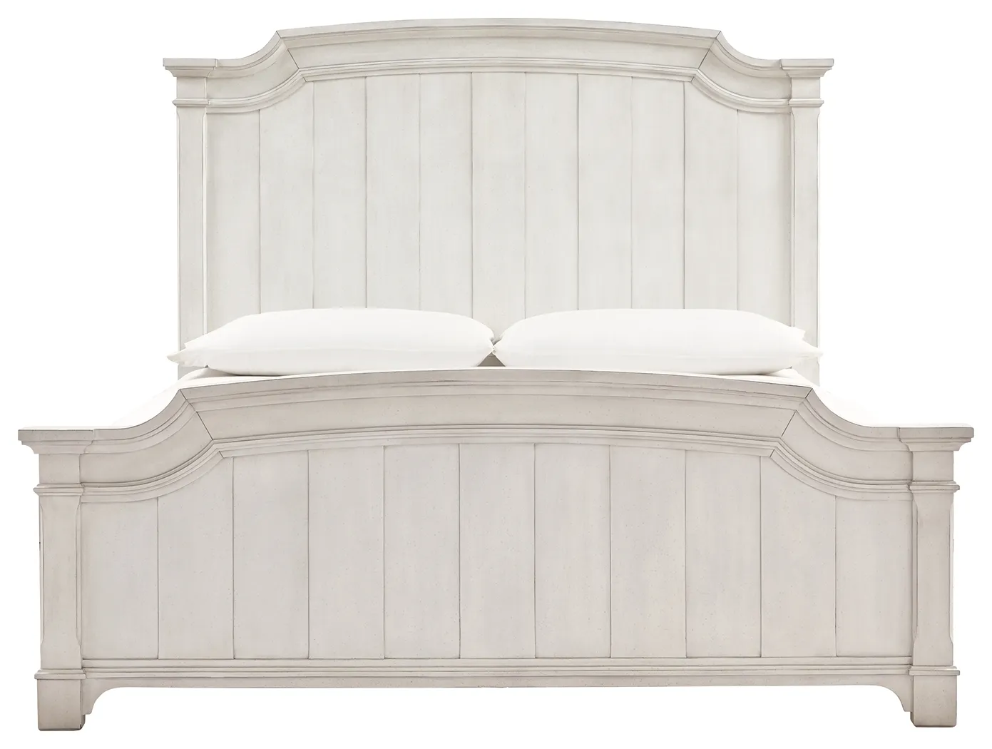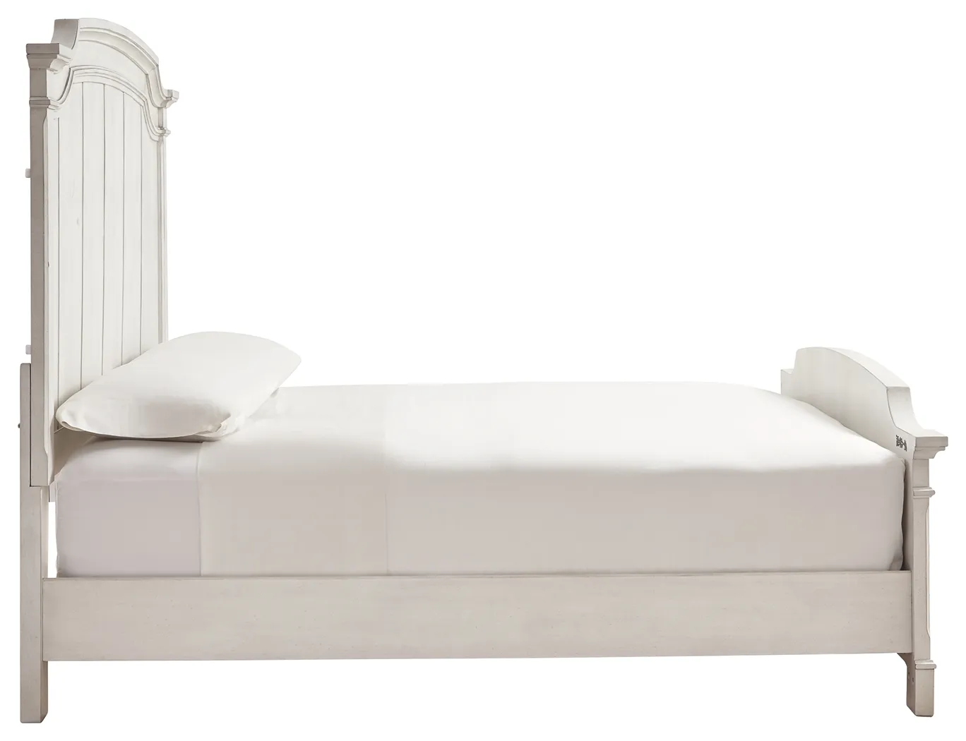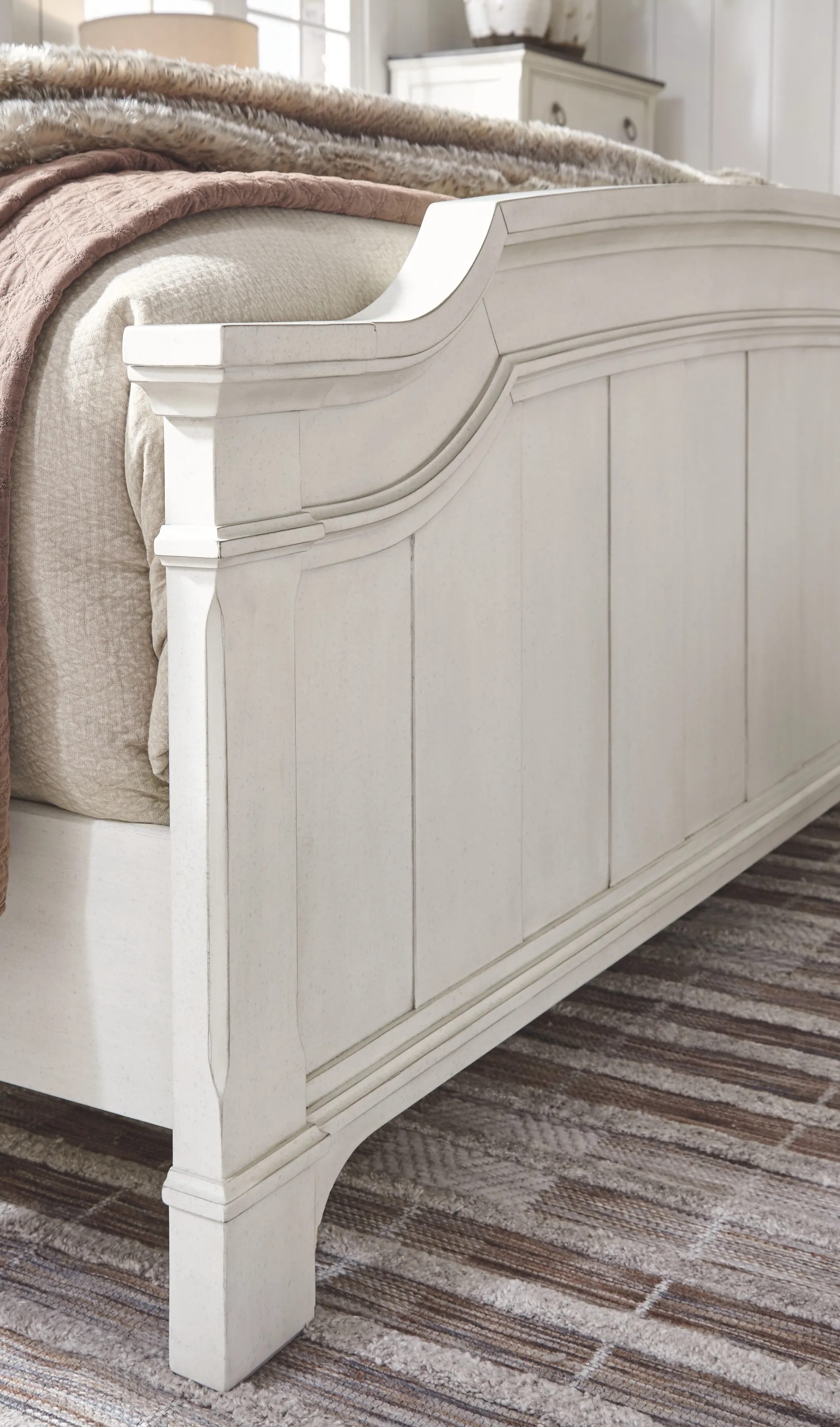 Crafted with a cottage-inspired look and feel, this panel bed delivers style with substance. Evoking so many qualities of vintage furniture-painstaking elements including plank-style panels, cut-away details and arched headboard-this bed references the best of the past and reinterprets it for today's more relaxed sensibilities. The impressive mansion headboard in a whitewashed finish heightens the farmhouse appeal.