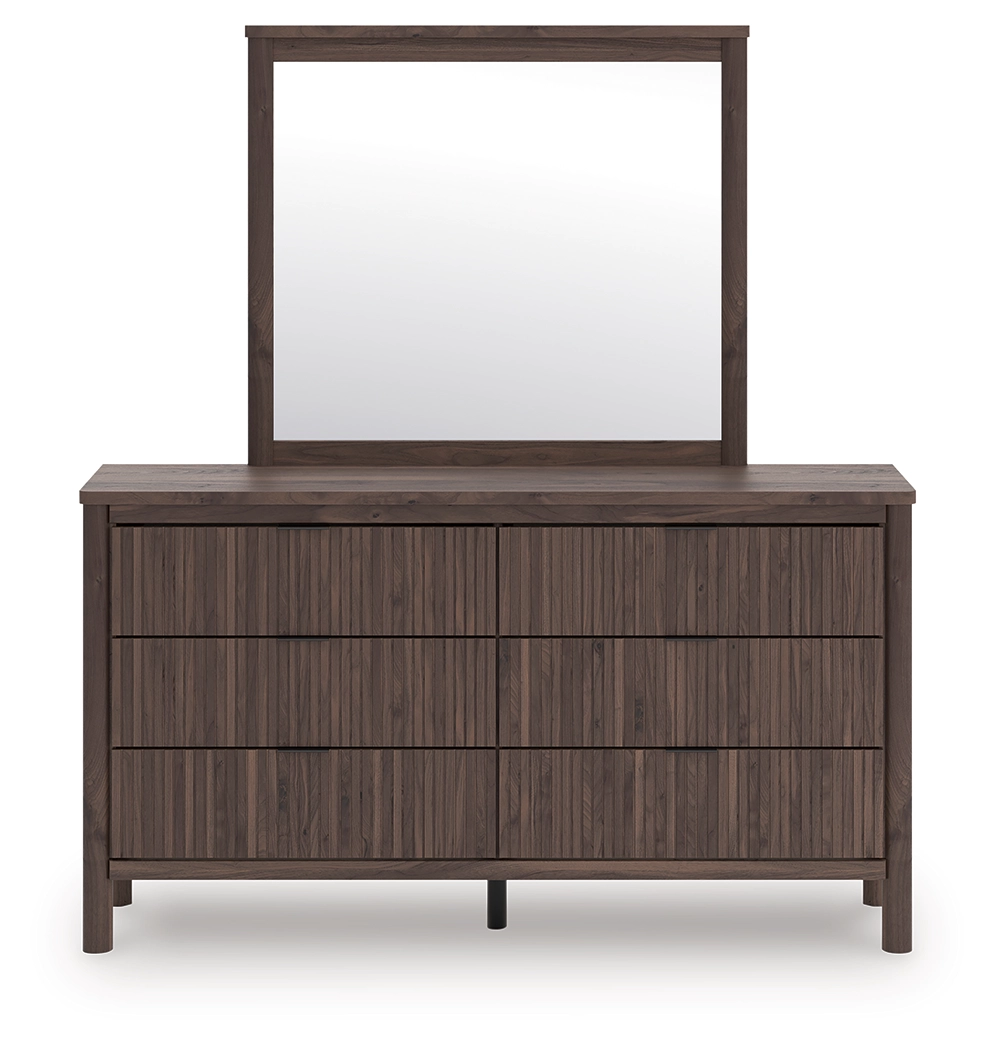 Crafted with both form and function in mind, this dresser with mirror brings a dash of retro-cool character to your modern boho aesthetic. Reeded accents add an on-trend touch to its classic silhouette. Warmly welcoming with a rich brown finish, this set pairs well with muted hues, earth tones and other neutrals alike. What a refined take on easygoing style.