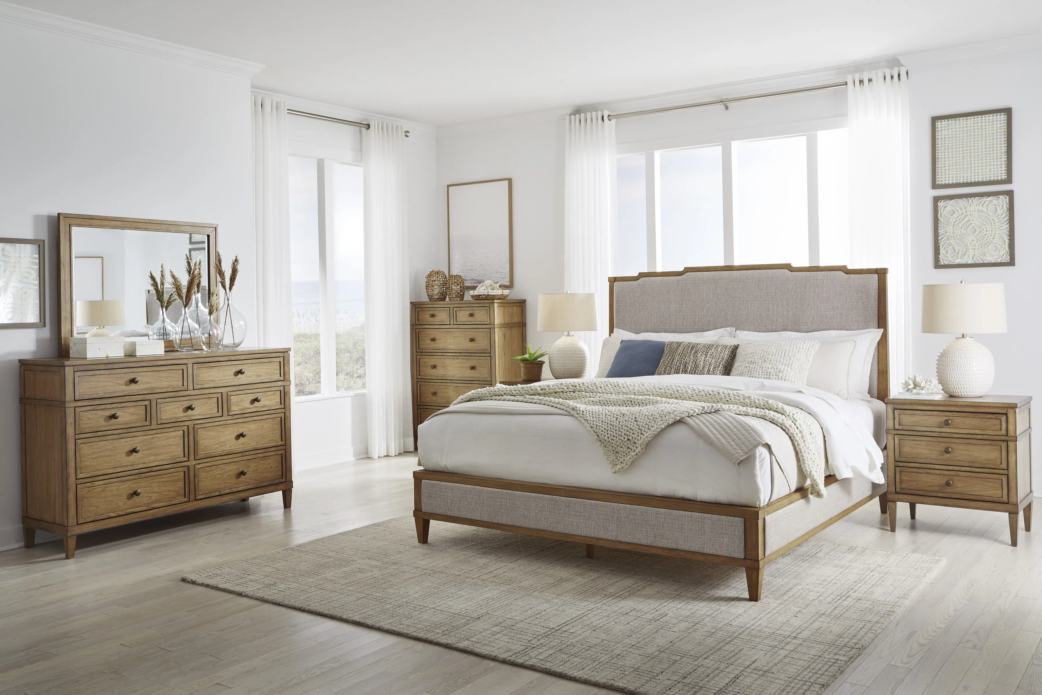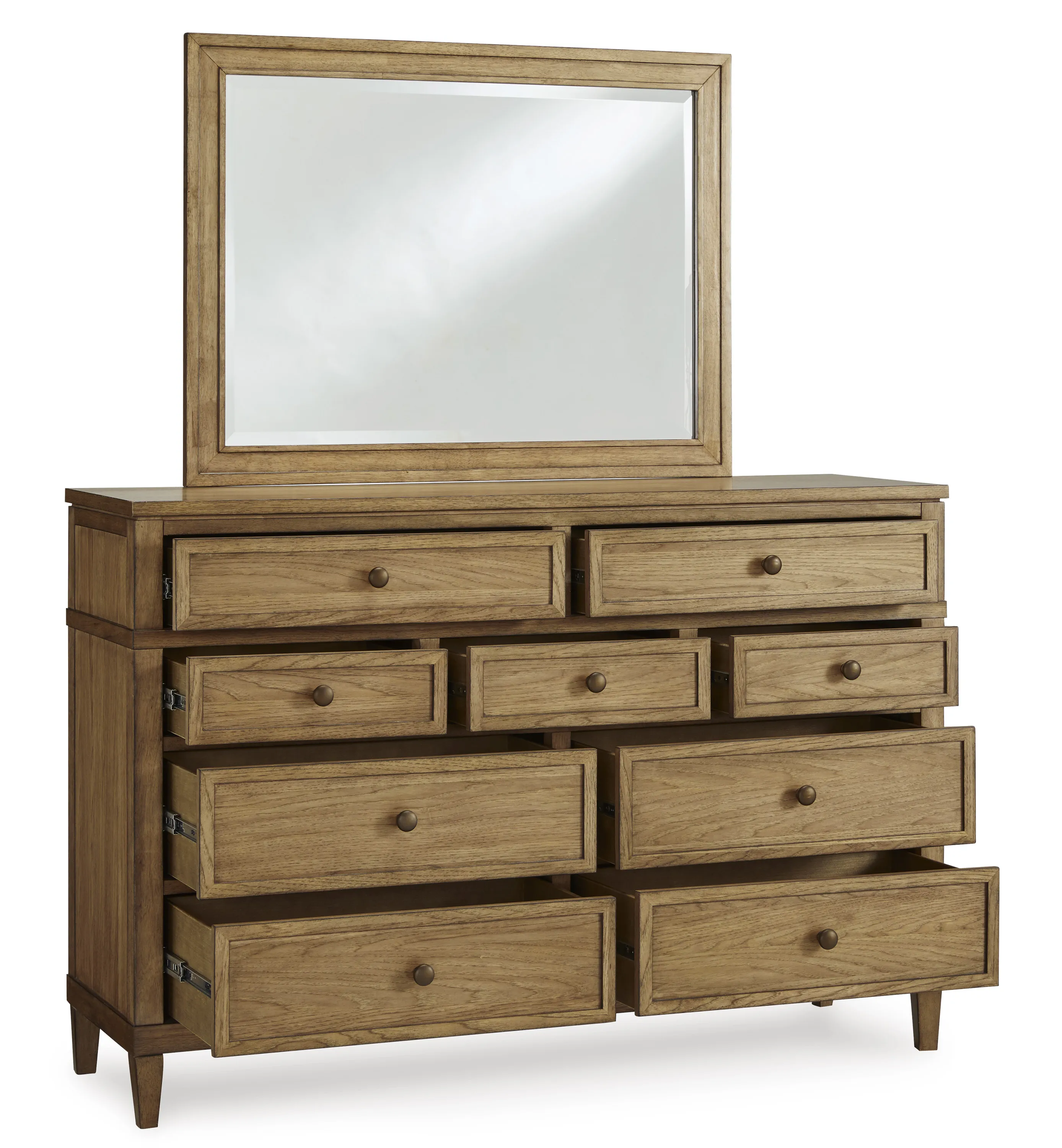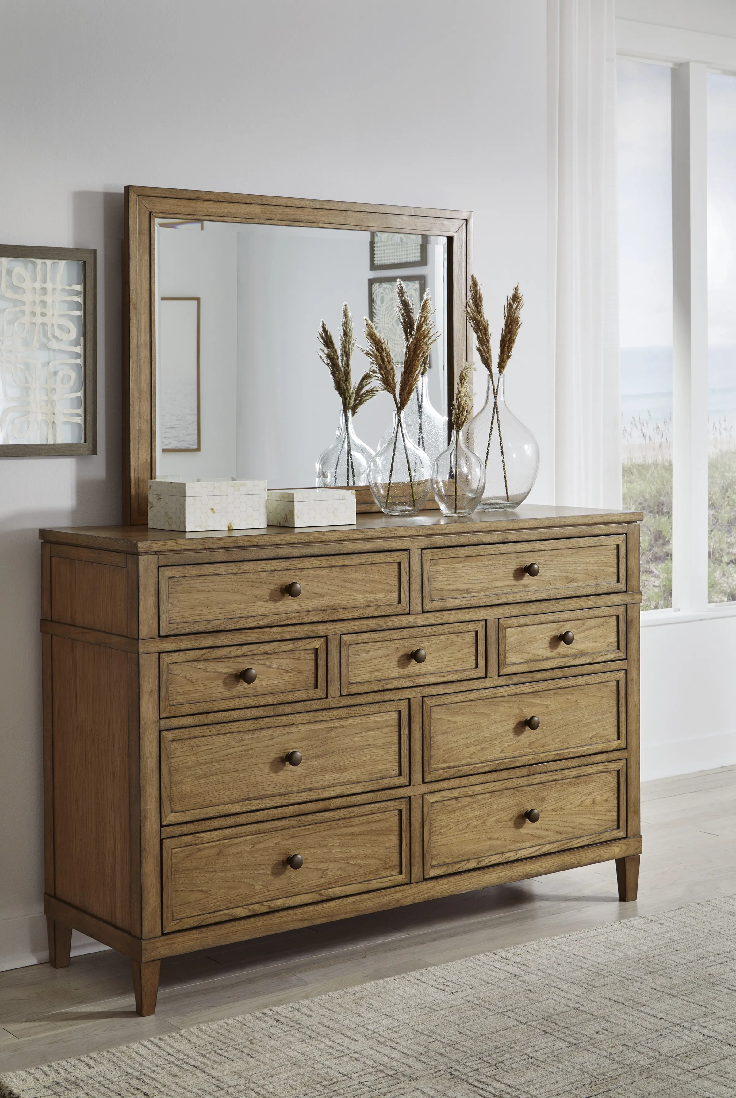 Taking a timeless approach to bedroom beauty, this dresser brings easygoing elegance to the everyday. With its light brown wood tone, it seamlessly slips into your room’s aesthetic. Dark bronze-tone pulls accent the assorted storage drawers, adding to the dresser's fresh approach to transitional stylings.