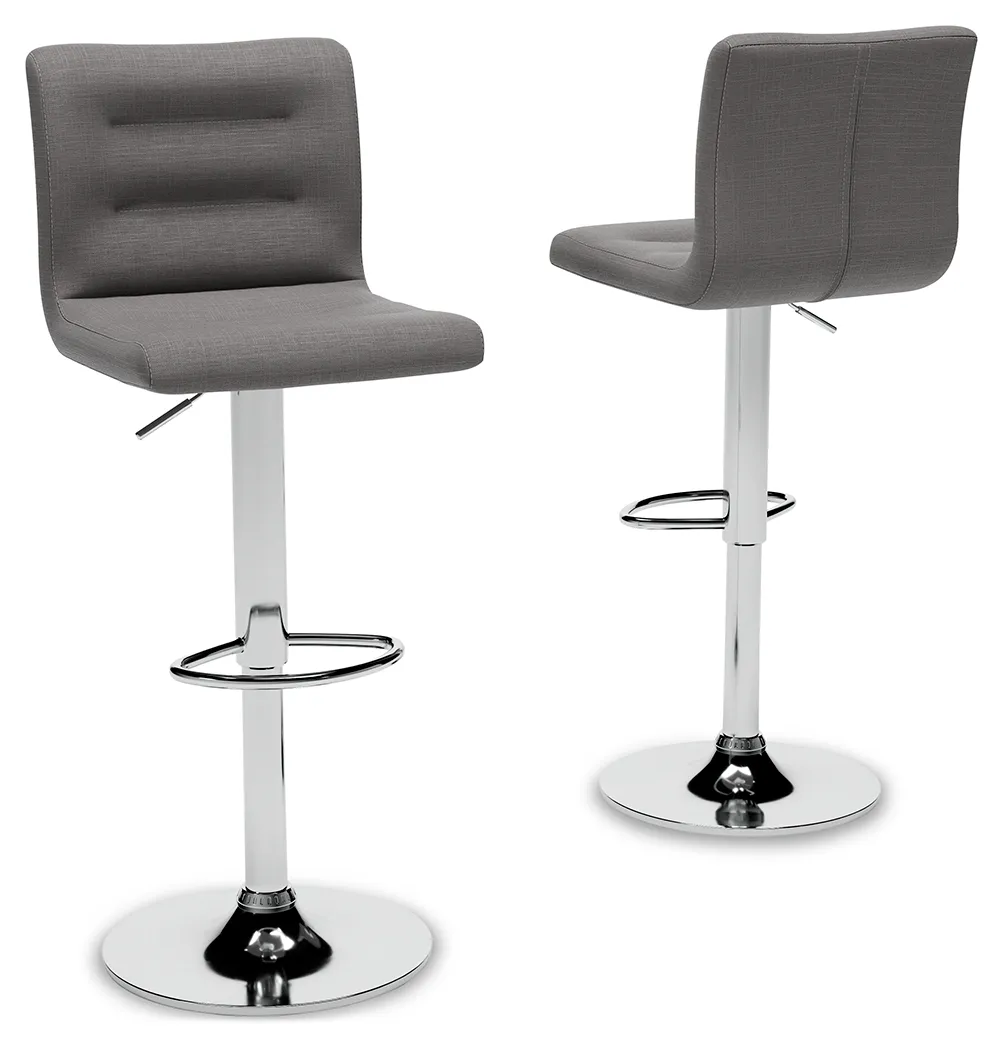 Have a taste for highly contemporary style? You’re sure to find this posh and polished set of 2 bar stools something to savor. Crafted with a sturdy steel frame beautified with a brilliant chrome-tone finish, this designer bar stool caters to your comfort with an adjustable height feature and swivel pedestal base. The cushioned seat and backrest are covered in a feel-good gray woven upholstery with channeled details that enhance its modern appeal.