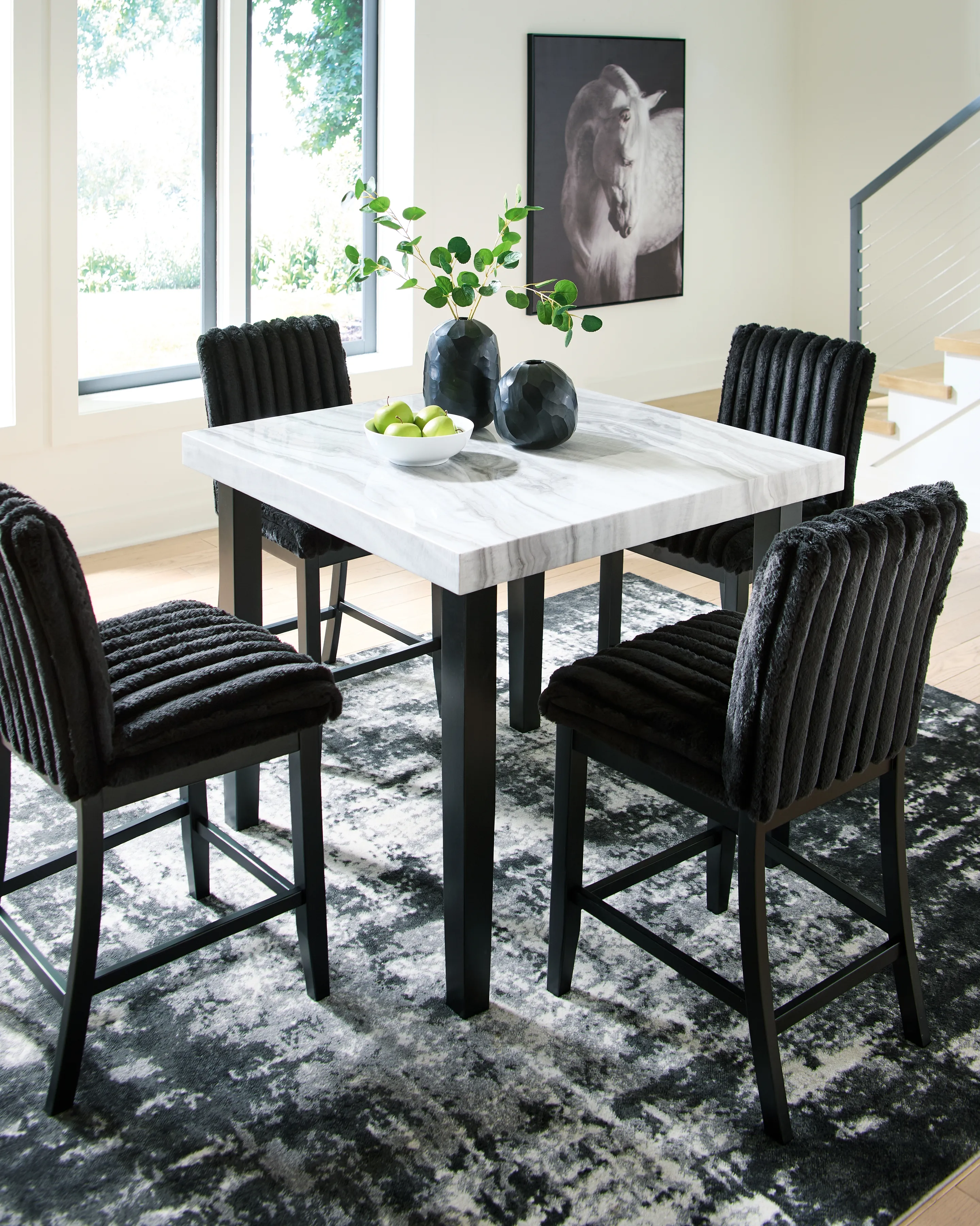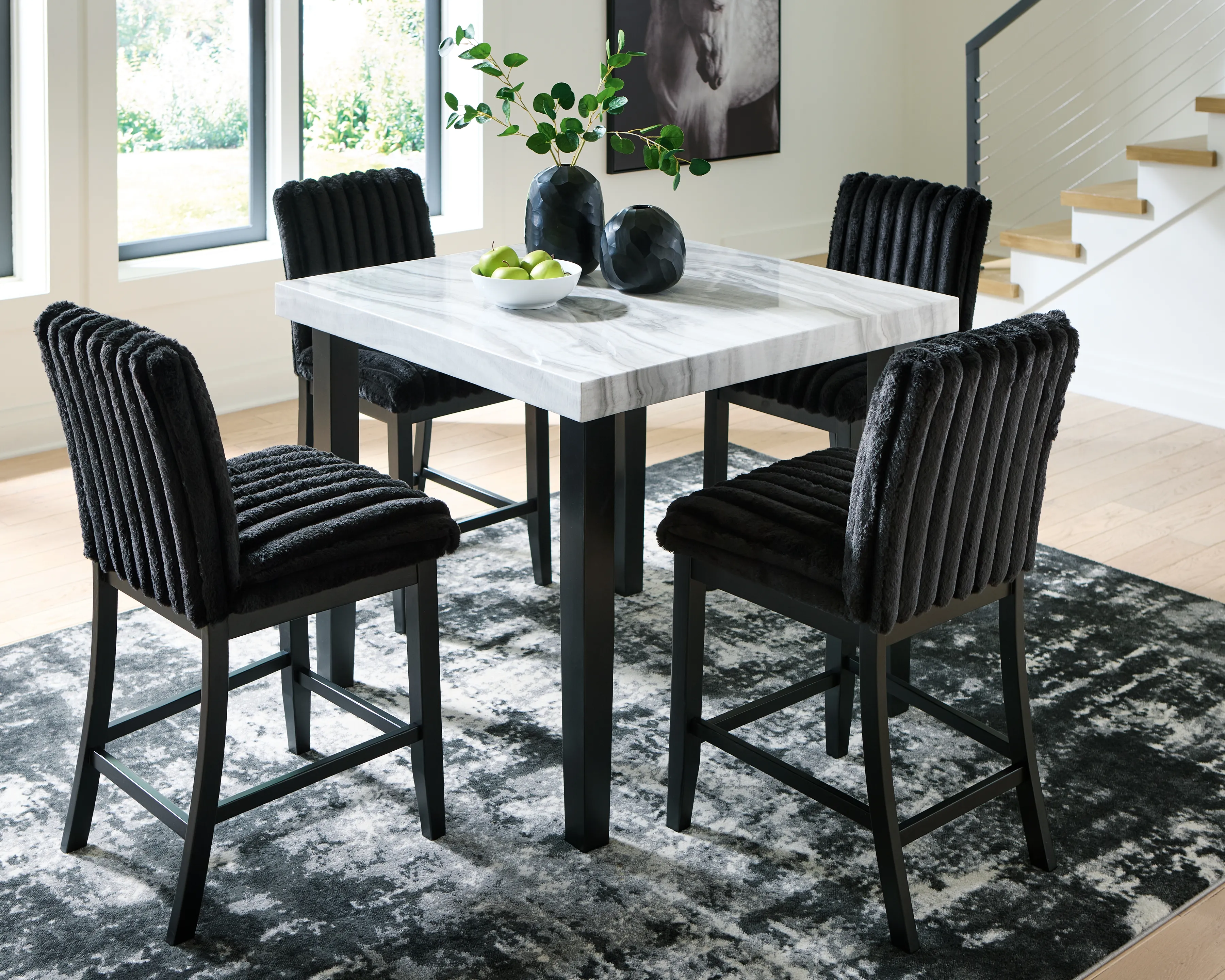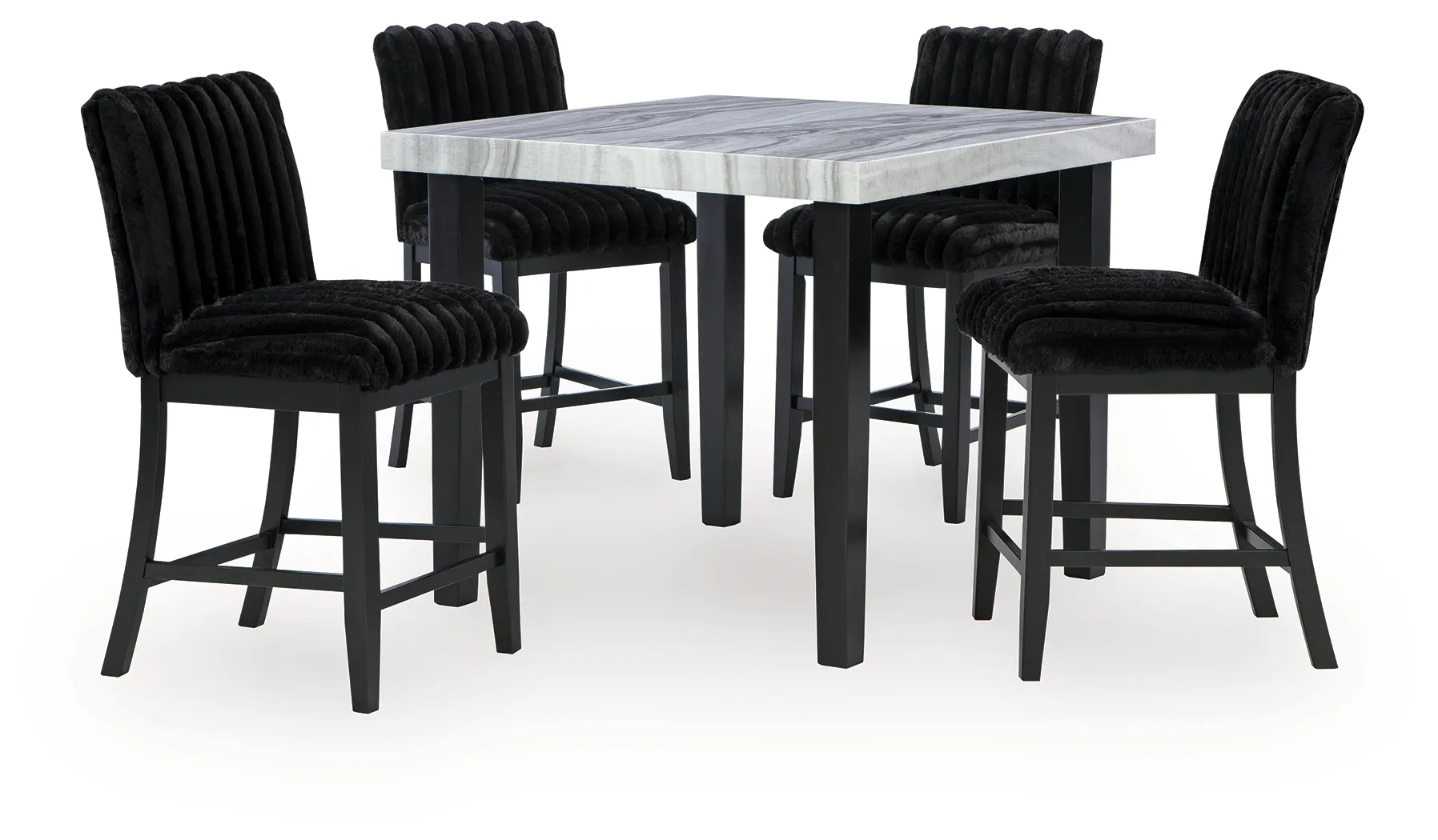 There’s contemporary style you love looking at and contemporary style you can comfortably live with. Have your fill of both with this dining package. Faux gray marble merges effortlessly with chic matte black wood for a look that's strikingly simple but wonderfully detailed. And ultra-cool jumbo corduroy upholstery creates a luxuriously soft modern vibe.