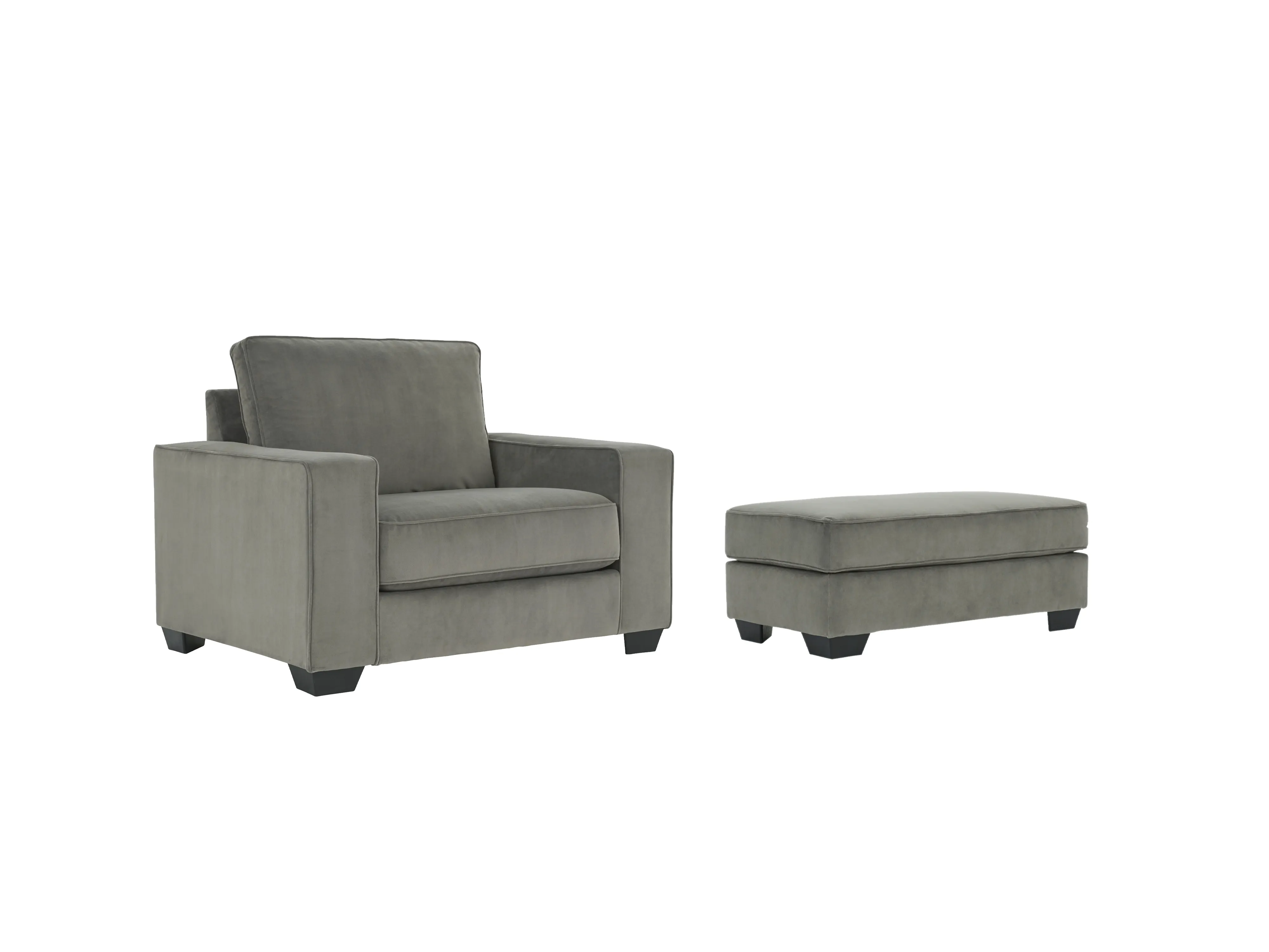 Serving up a refined, upscale look—at an incomparable value price—this chair and ottoman package lures from every angle. Crisp box cushioning, wide track arms and black tapered feet lend a clean, contemporary aesthetic. Velvety soft upholstery in a chic sandstone gray takes neutral to another level.
