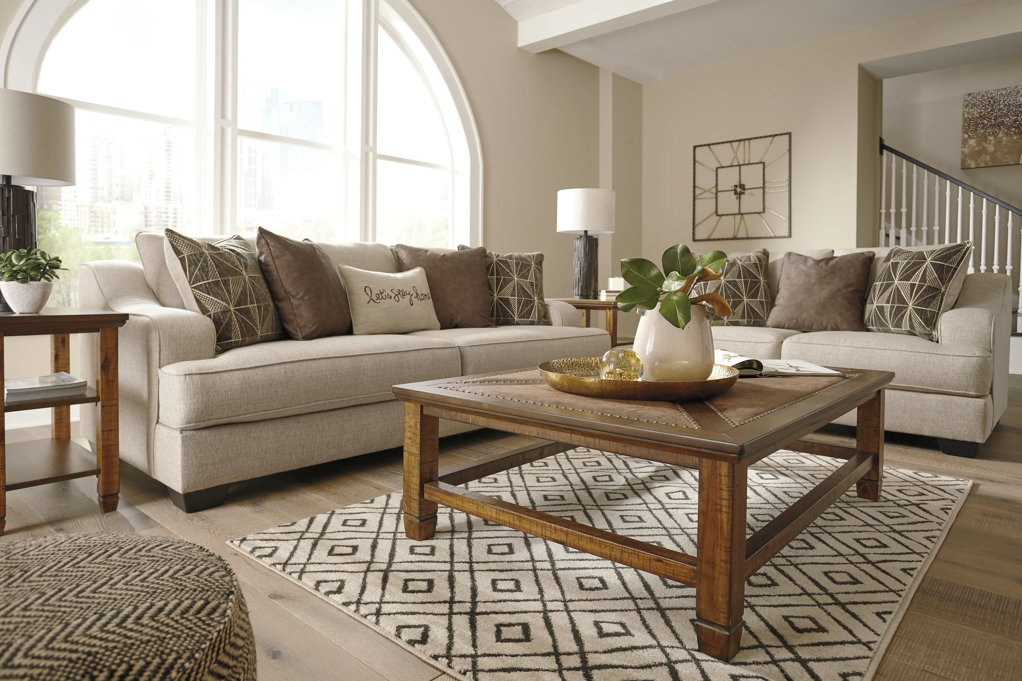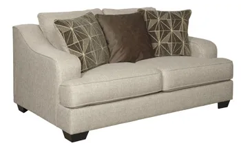 "Let's stay home." Why not? It's so easy to do with this loveseat. Tantalizing fabric texture and sloped arms encourage a comfy sit-down. And when you need to fluff up the cushions, simply reverse them. Neutral color ties right in with your existing decor. Throw pillows in contemporary, geometric pattern and solid brown complement the loveseat beautifully.