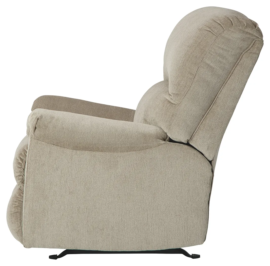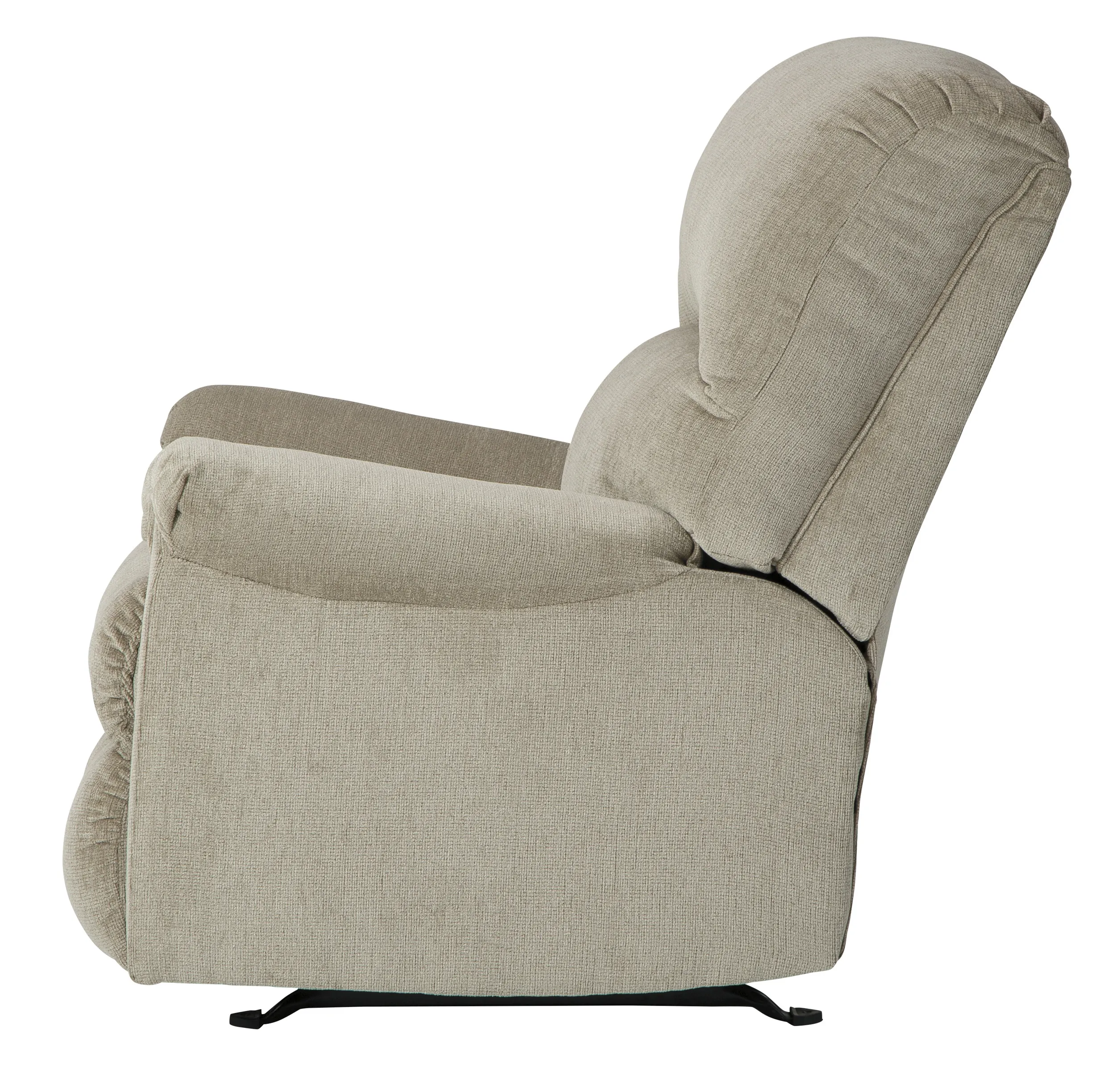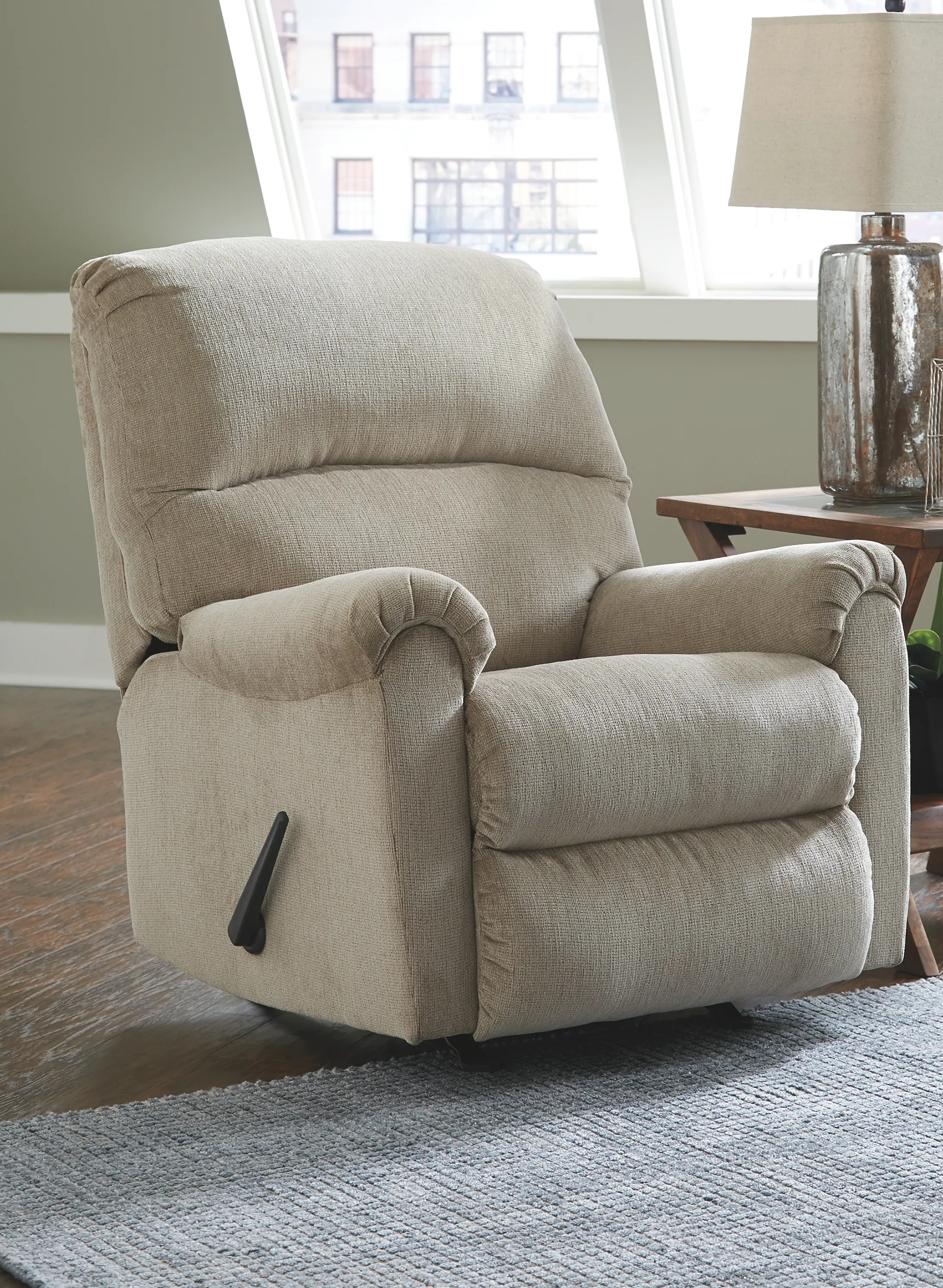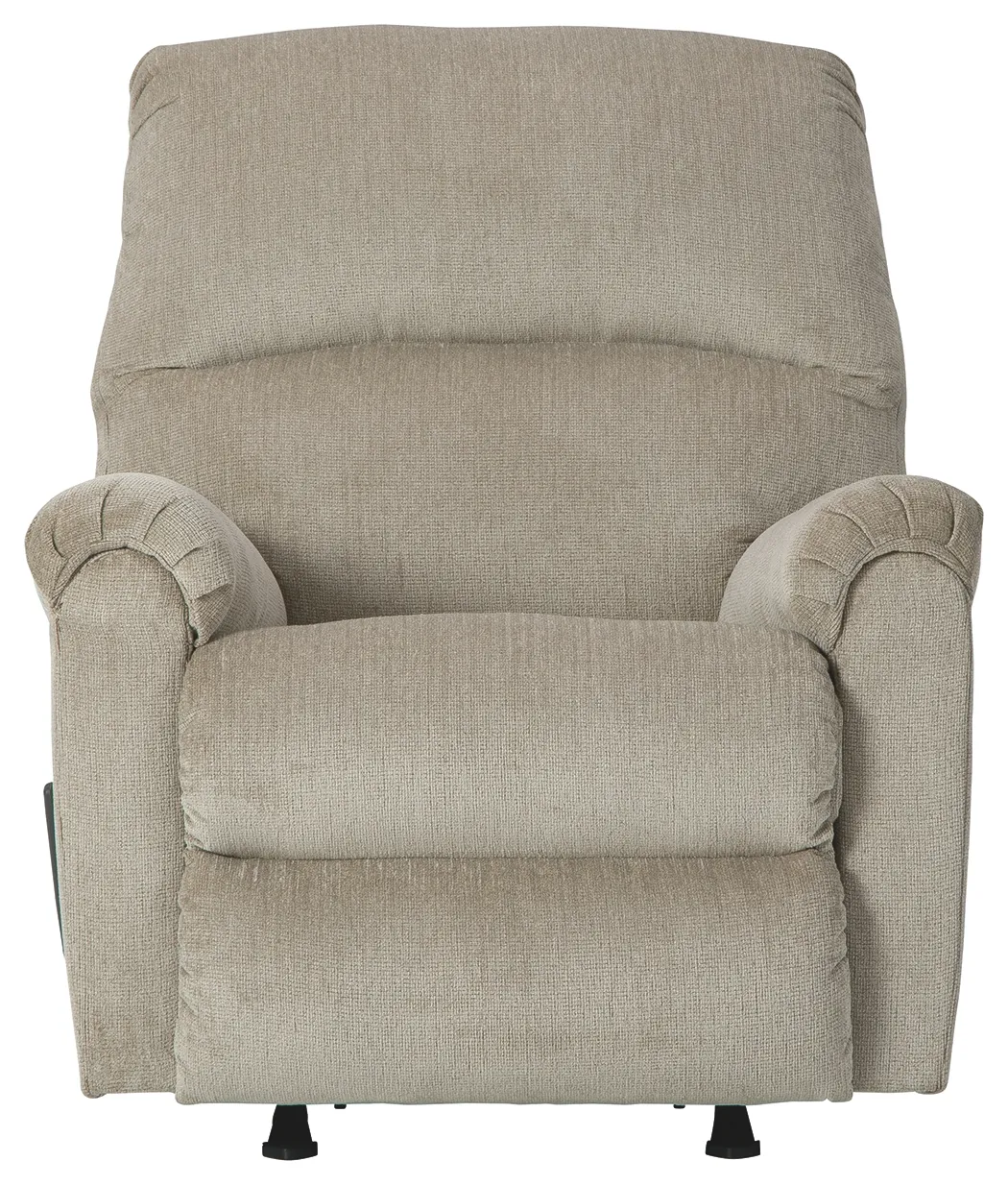 This rocker recliner has the corner on ultra-contemporary style made for easy, everyday living. Upholstered in a plush tan chenille, it takes neutral sophistication to another level. Kick back and relax. The look you love comes with a luxurious feel: at a price to entice.