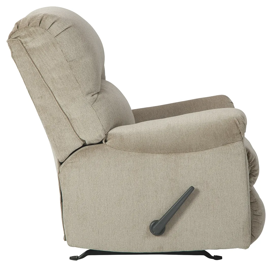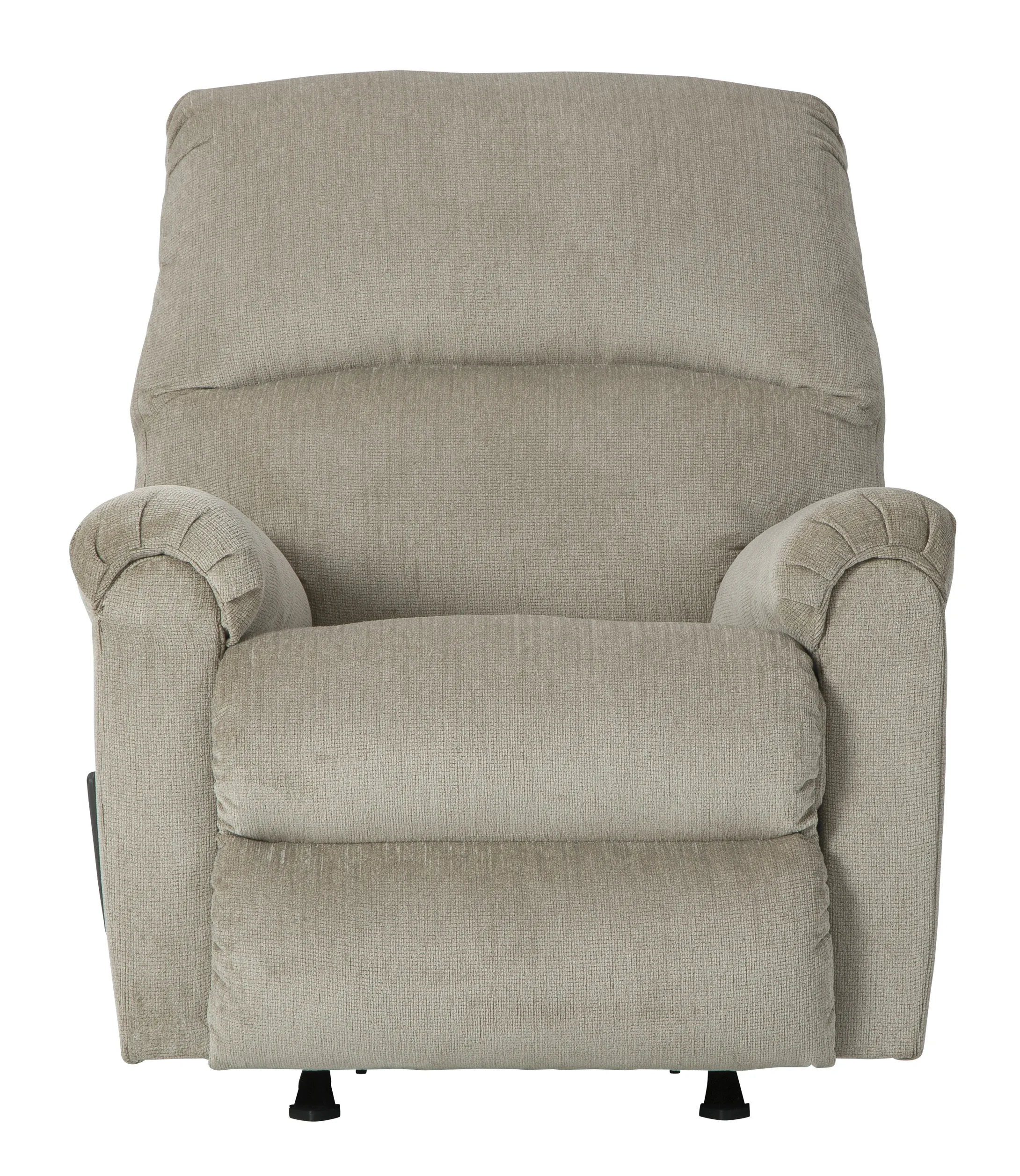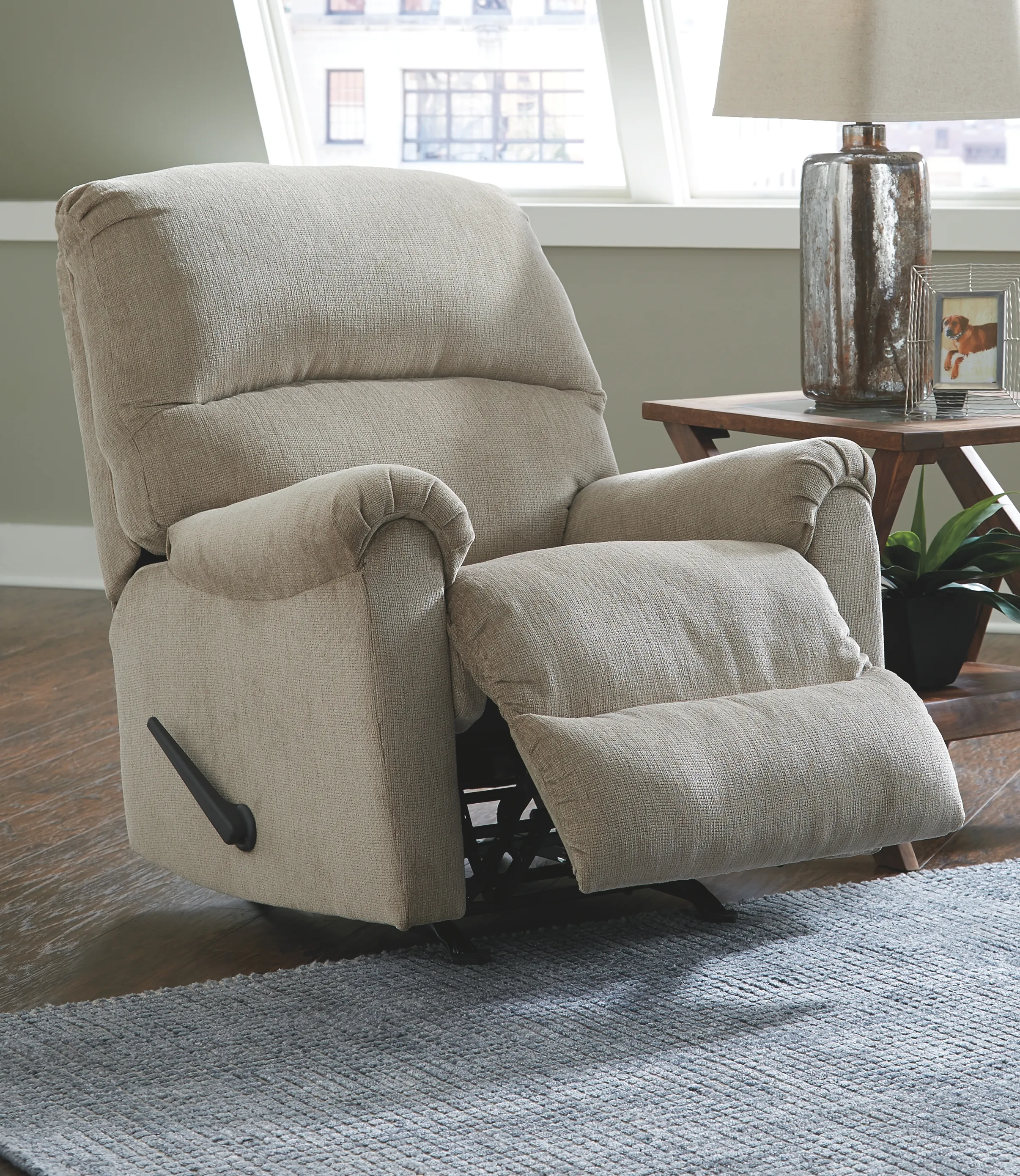 This rocker recliner has the corner on ultra-contemporary style made for easy, everyday living. Upholstered in a plush tan chenille, it takes neutral sophistication to another level. Kick back and relax. The look you love comes with a luxurious feel: at a price to entice.