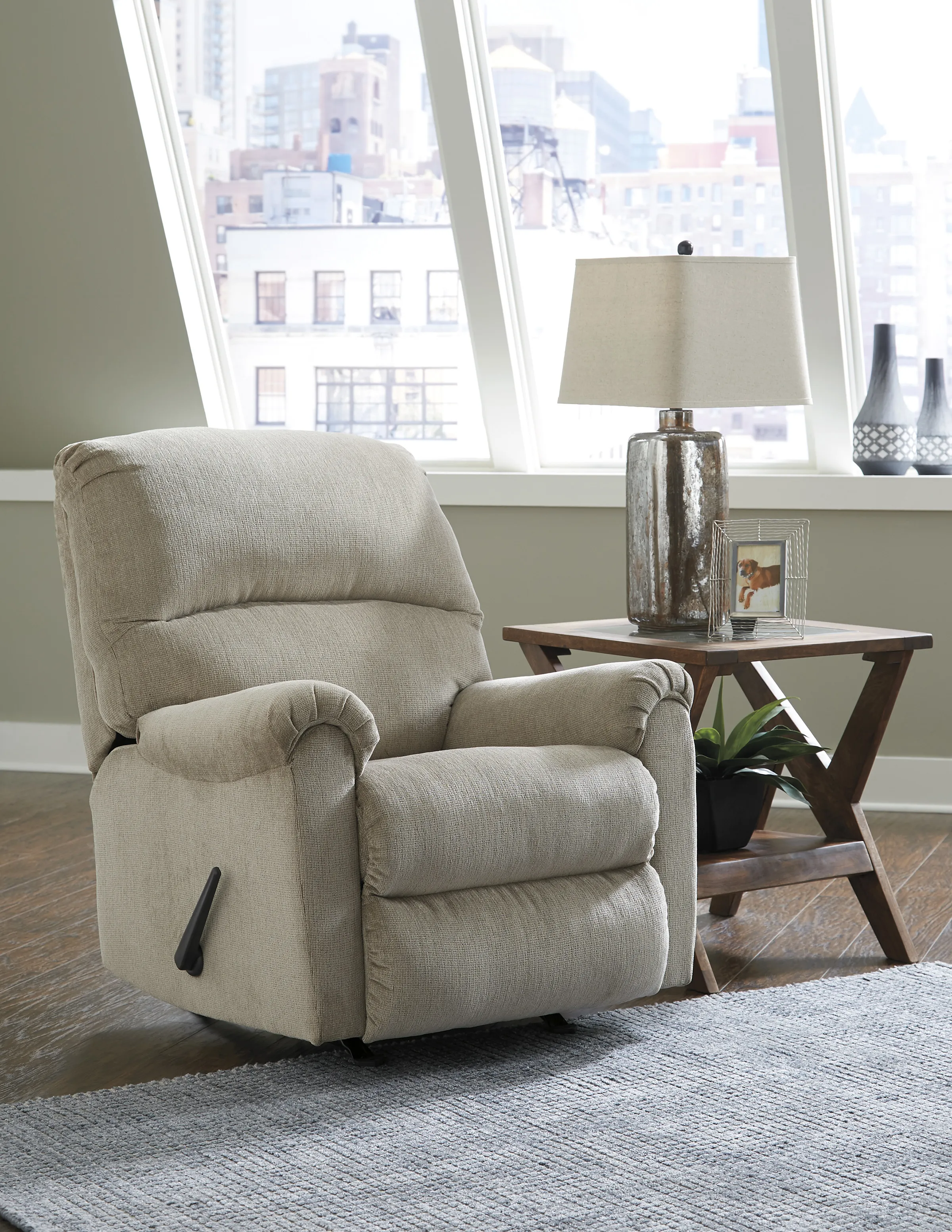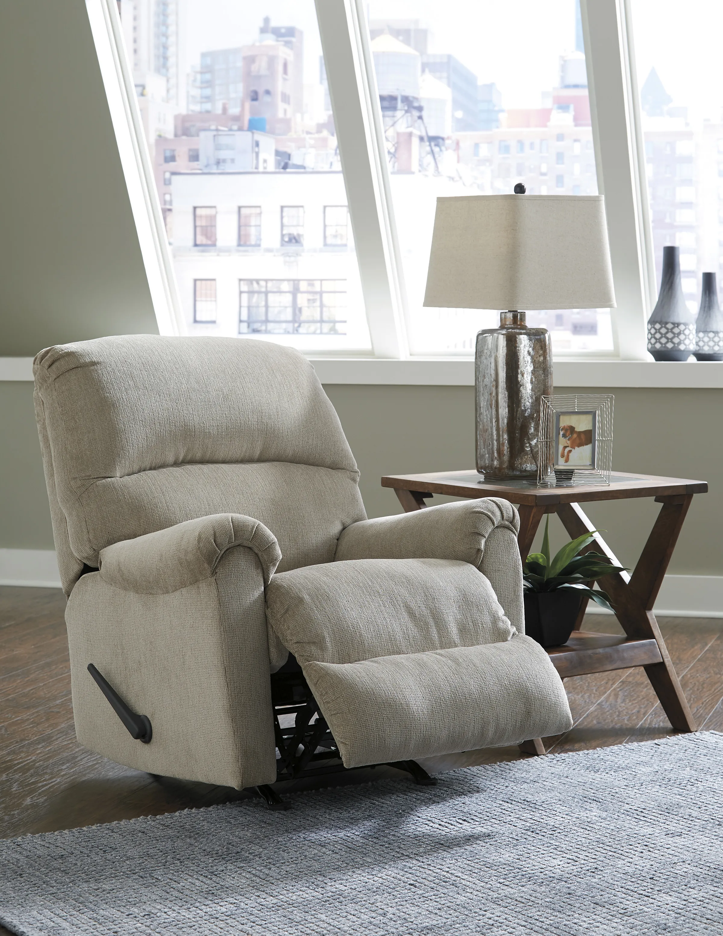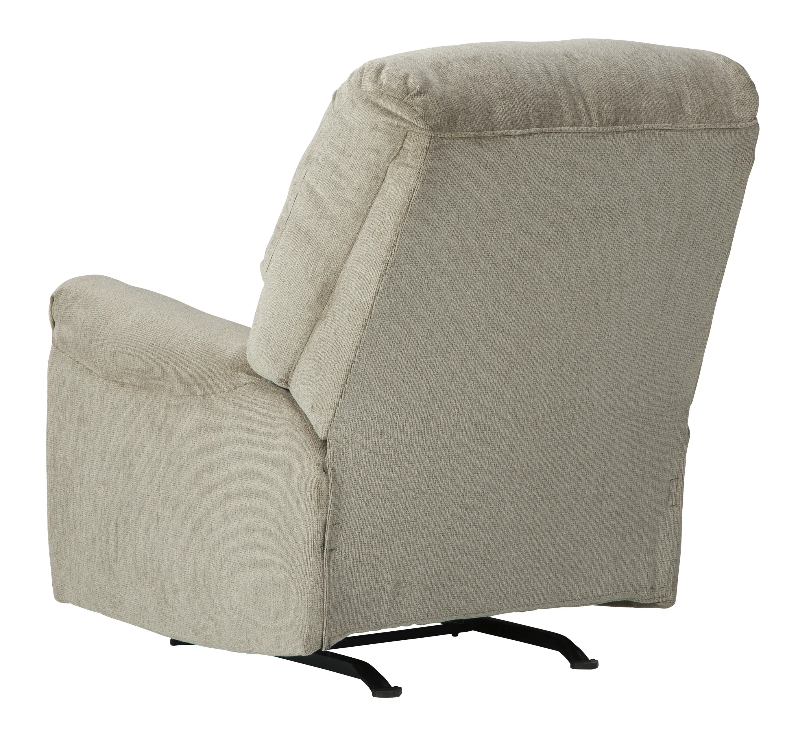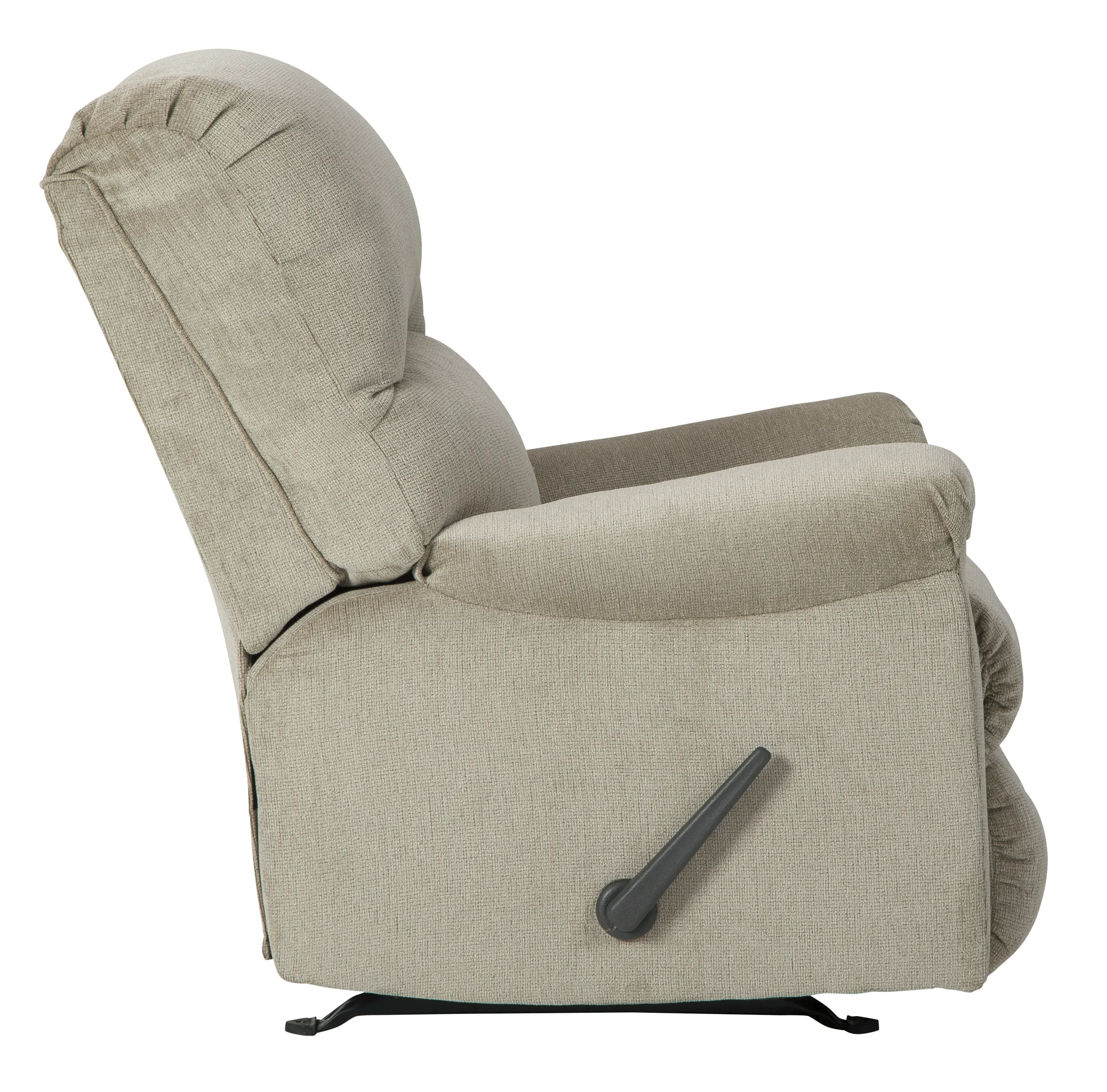 This rocker recliner has the corner on ultra-contemporary style made for easy, everyday living. Upholstered in a plush tan chenille, it takes neutral sophistication to another level. Kick back and relax. The look you love comes with a luxurious feel: at a price to entice.