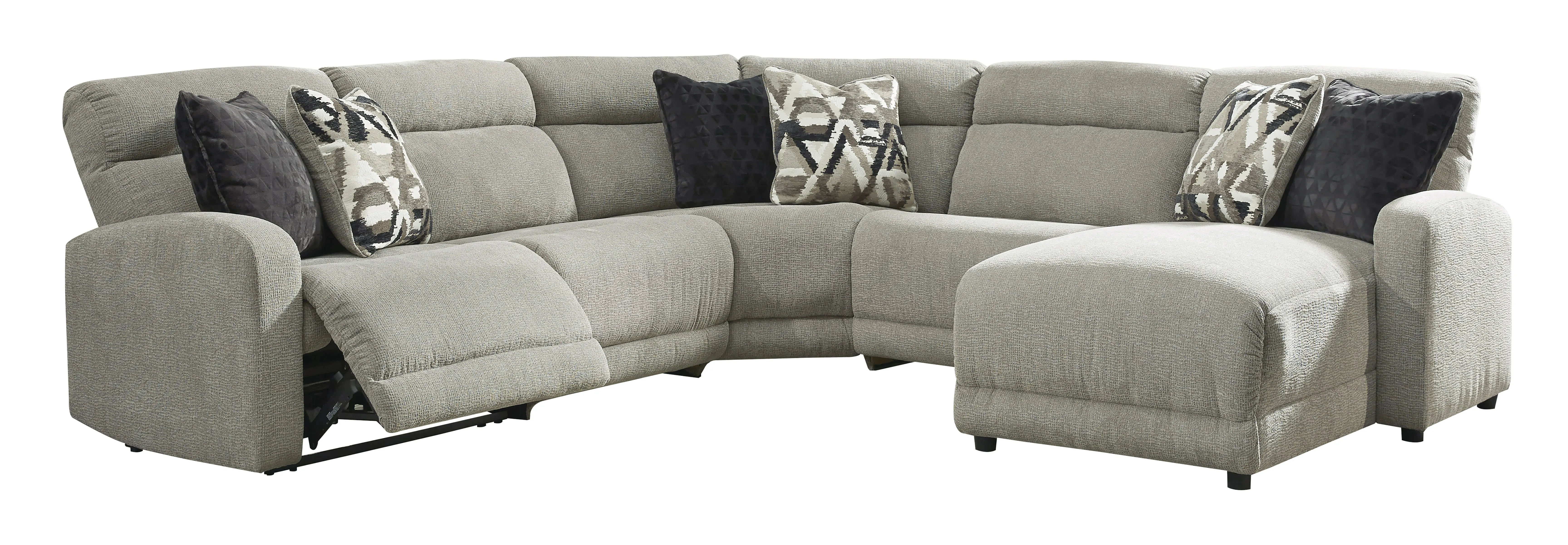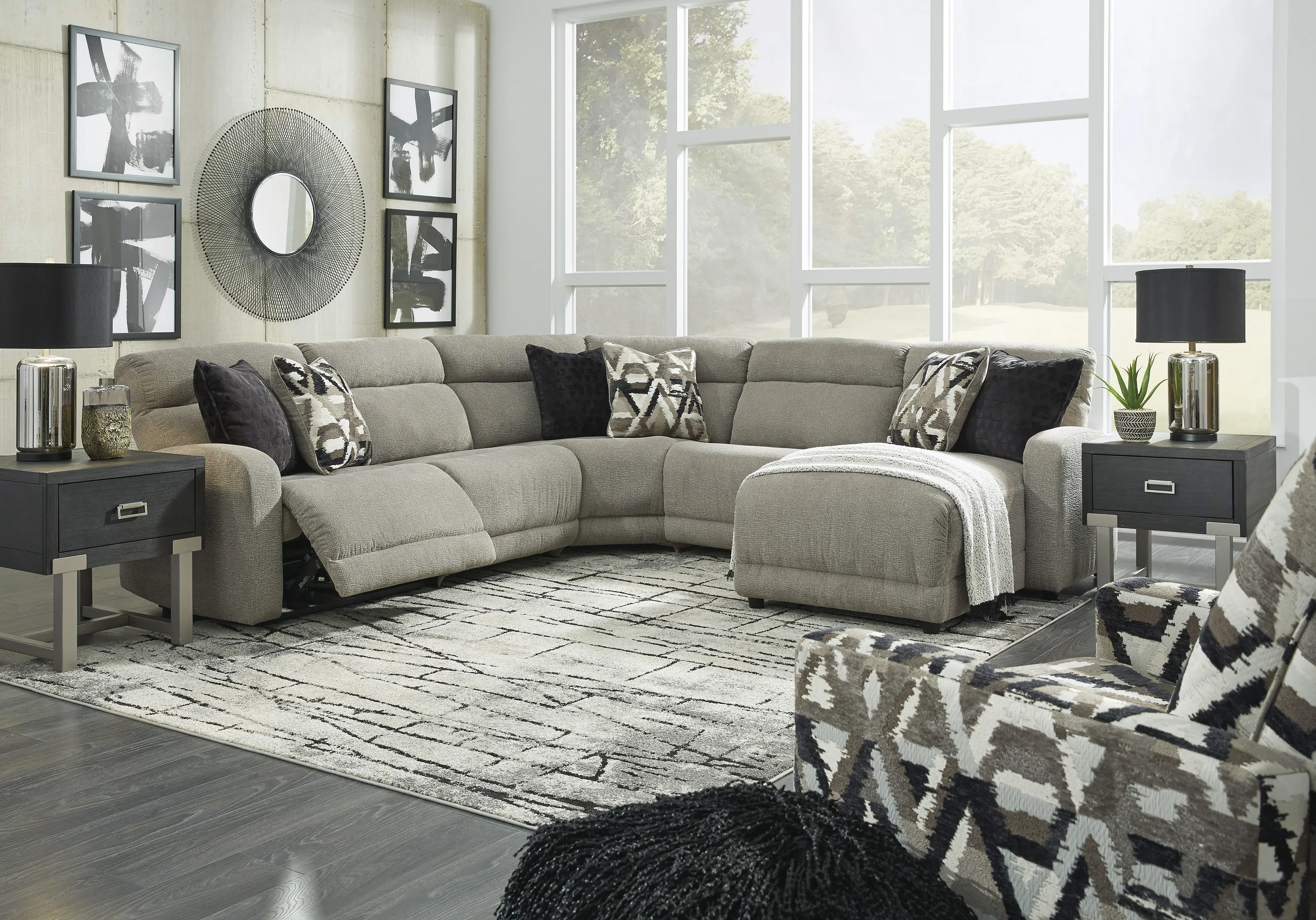 Delightfully modern. Exceptionally comfortable. When it comes to modular furniture with easy-elegant appeal, it's hard to beat this 6-piece power reclining sectional. Wrapped in a decadently plush stone-tone fabric for neutral versatility, this chic sectional is dressed to impress with a clean-lined divided back, curved track arms and a low-profile back for a relaxed, contemporary aesthetic.