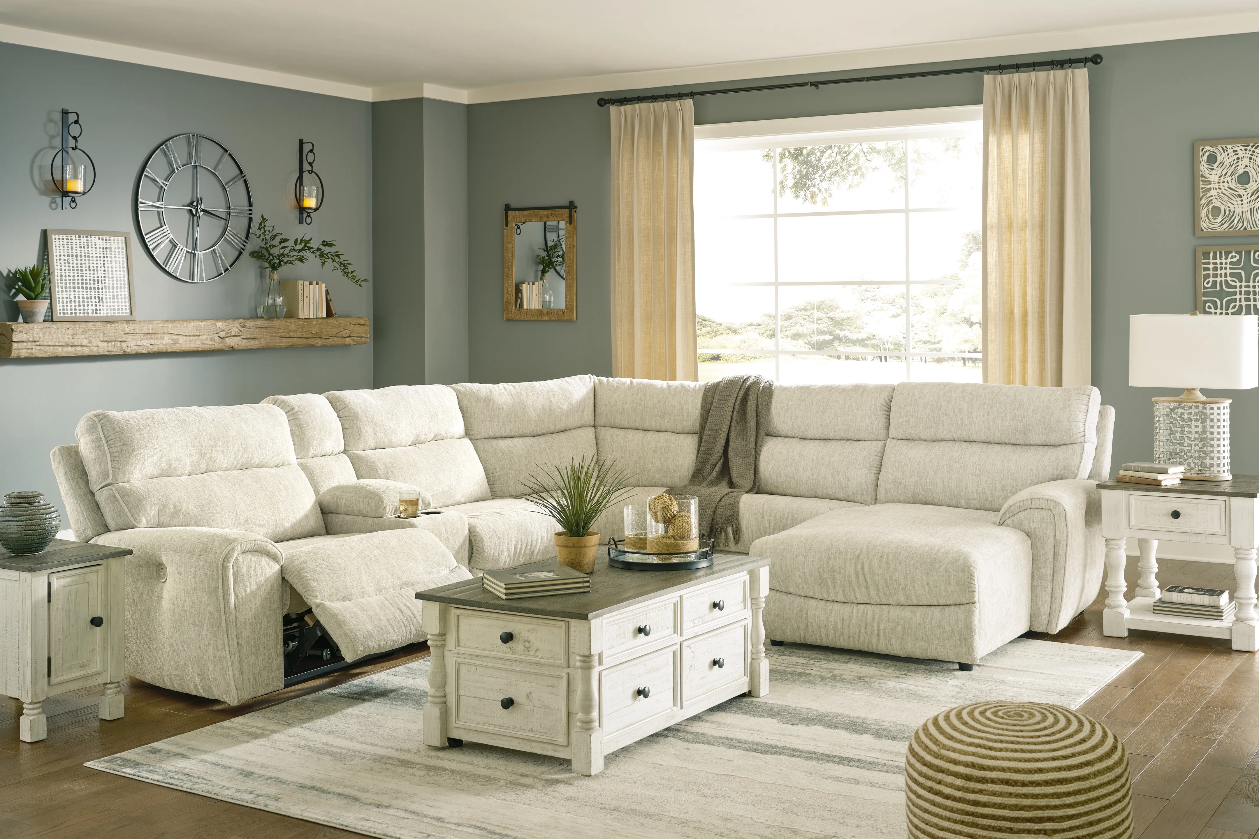 Includes 6 pieces: left-arm facing power recliner, armless recliner, armless chair, console with storage, wedge and right-arm facing press back power chaise
