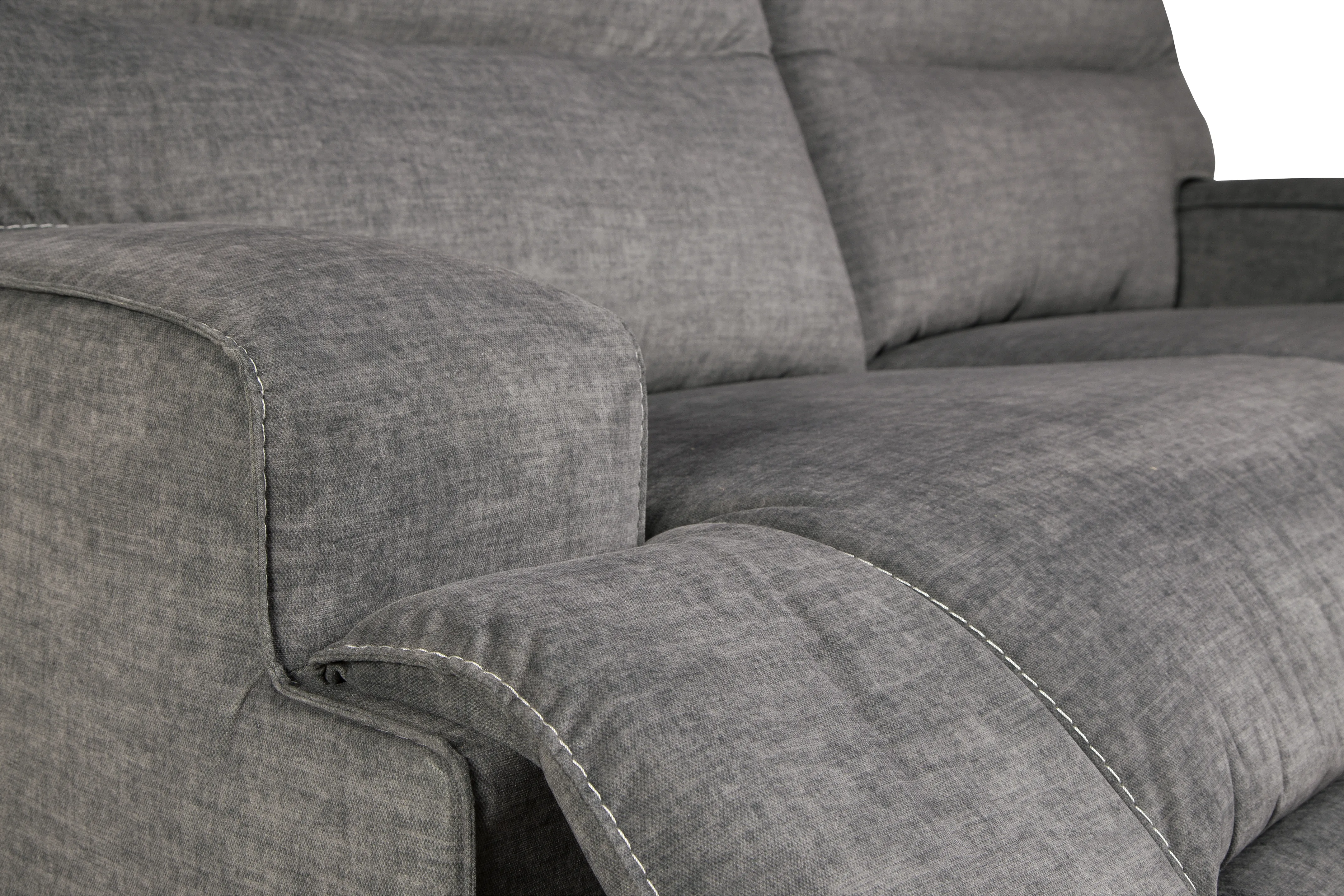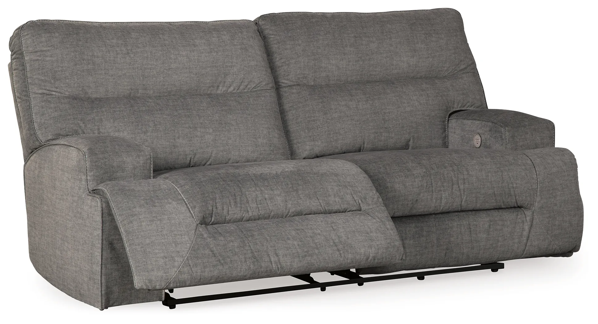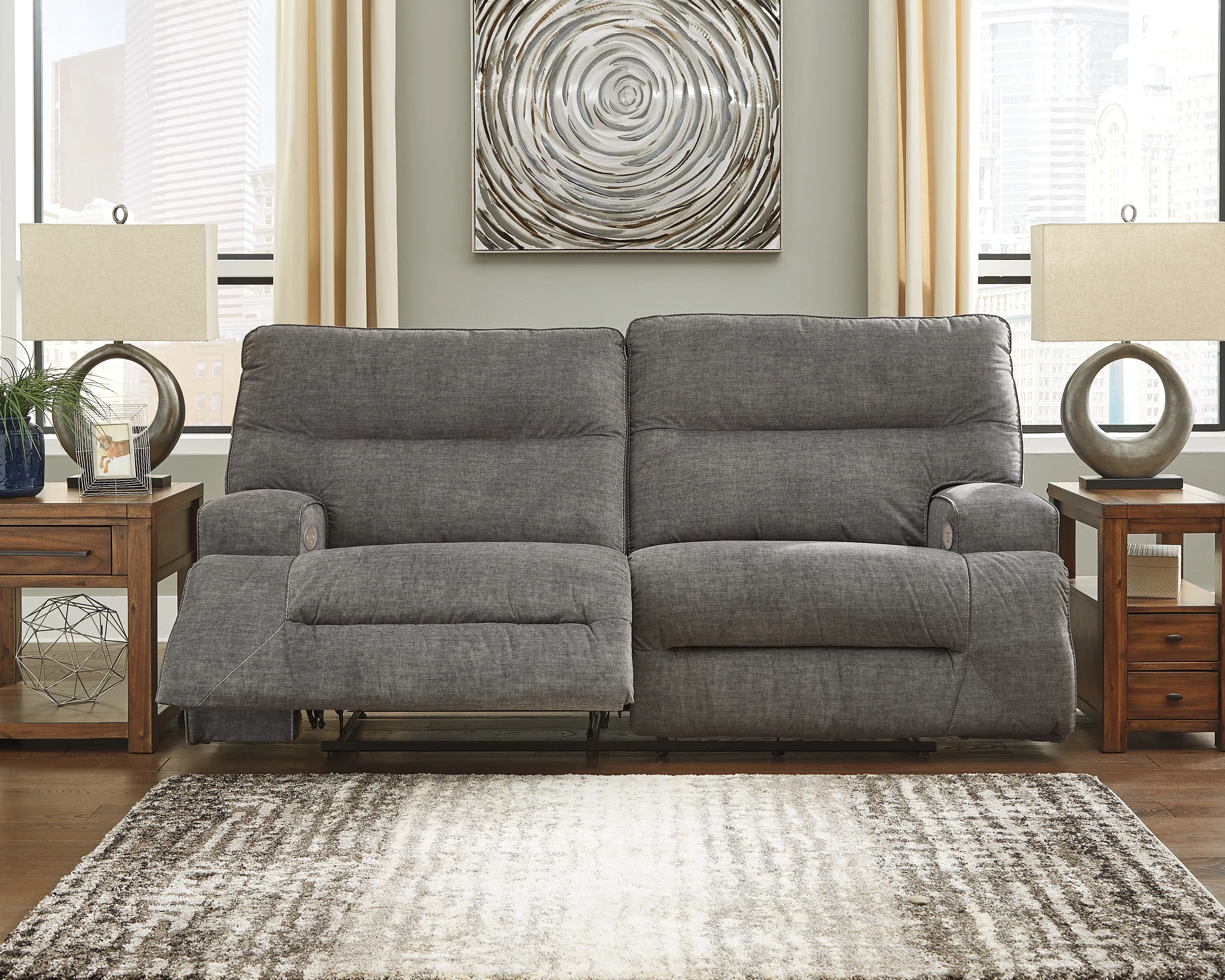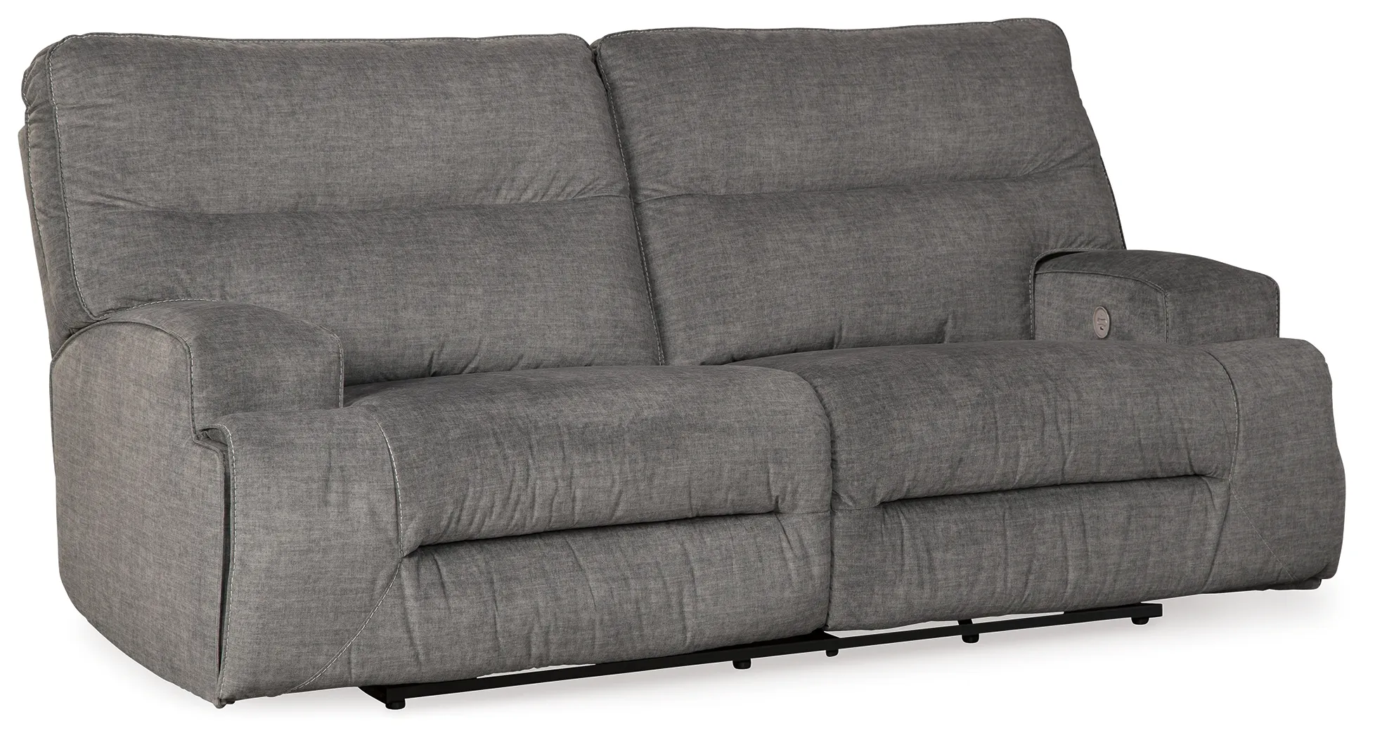 This reclining power sofa makes it hip to be square. Brilliantly boxy profile and wide track arms infuse a highly contemporary look you don't often find in reclining furniture. Rest assured, the trendy charcoal-tone upholstery is sumptuously soft-and made all the more enticing with deep channel tufting for clean-lined flair. The one-touch power control even includes a USB port to keep devices charged while you unplug.