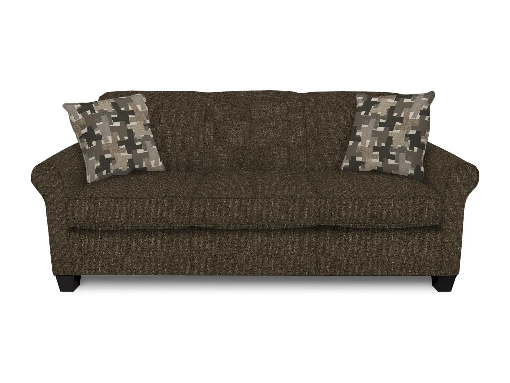 Mix equal parts style, value, and versatility and our Angie collection is what you get. Its clean silhouette is achieved with a tight back, a P-shaped roll arm, and an exposed wood leg. This fashion-forward silhouette can go from understated and sophisticated to fabulous and fun with the change of a fabric. We offer a sofa, loveseat, chair, ottoman, twin, full, and queen sleepers as well as multiple sectional configurations in this collection. Take a look at Lilly for leather options.