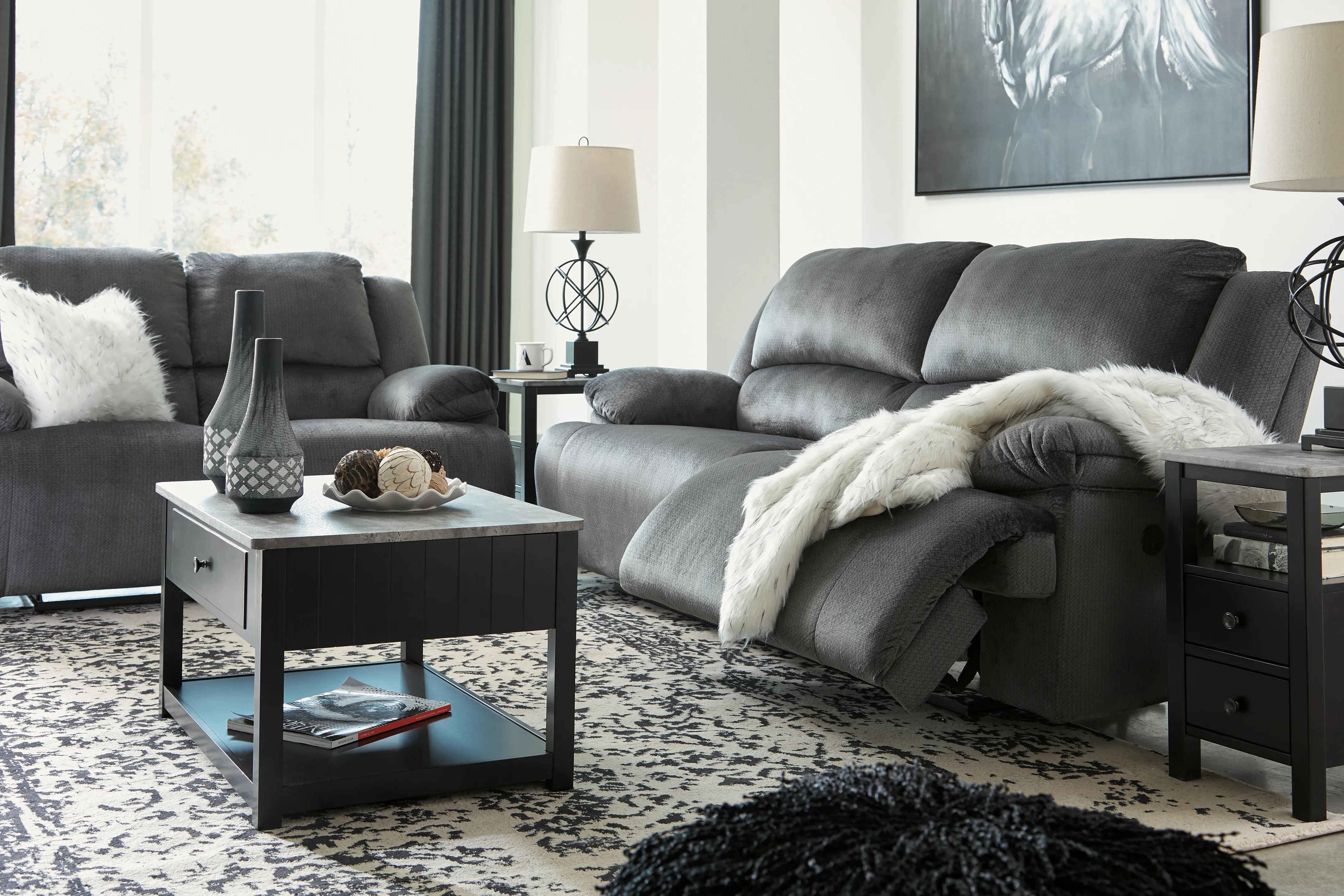 Large-scale comfort is yours with this 2-seat reclining power sofa. With supremely padded back, seat and arm cushions, it's the hero for ultimate relaxation. Microfiber upholstery is welcoming, soft and luxuriously covers the extra-wide seats. Recline the back and kick up your feet to bolster your comfort level even more.
