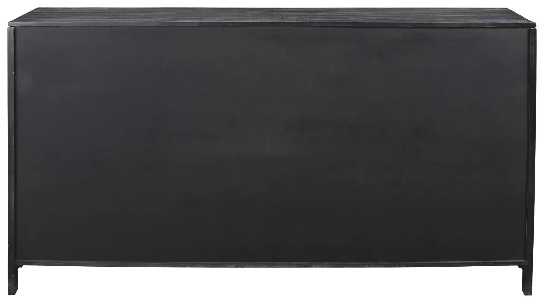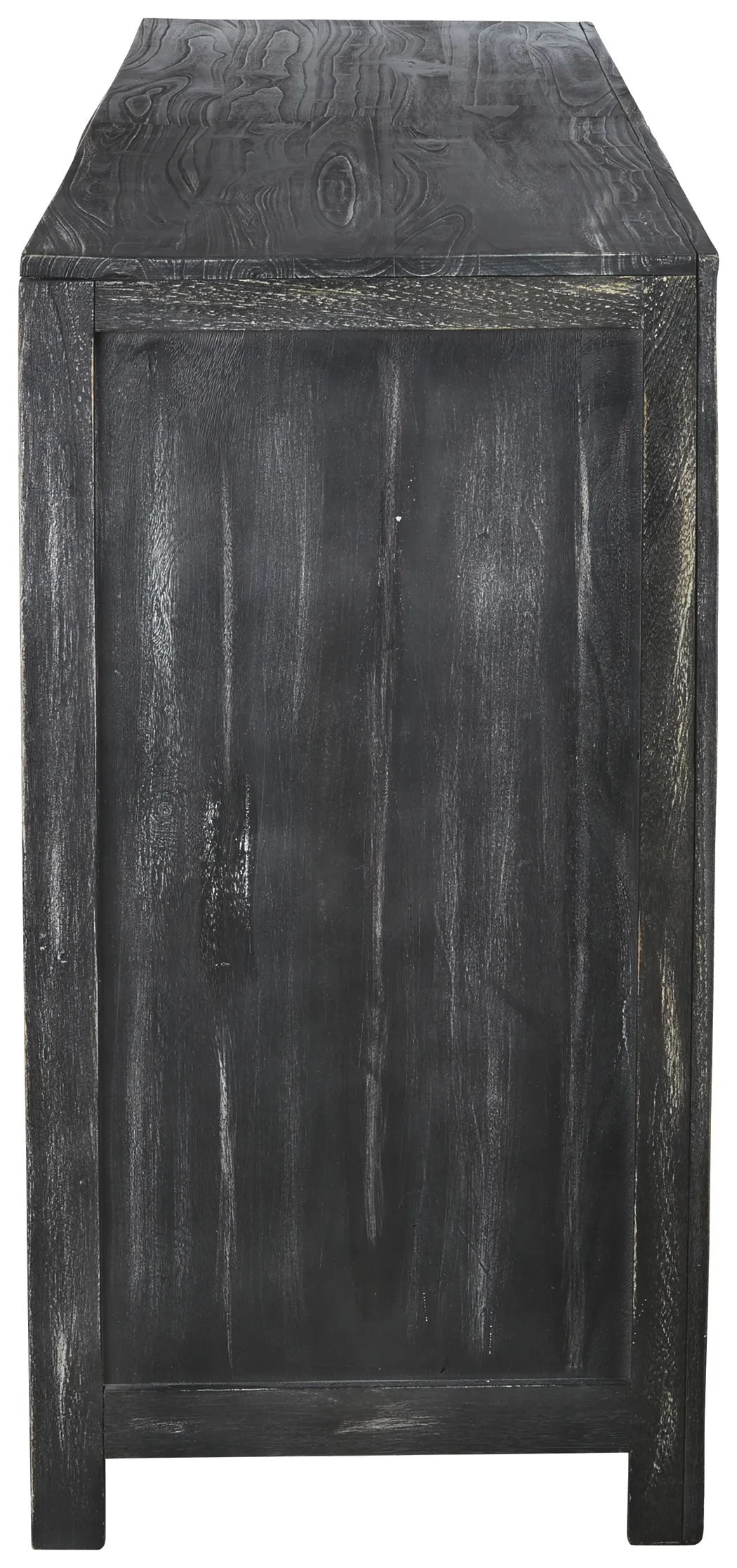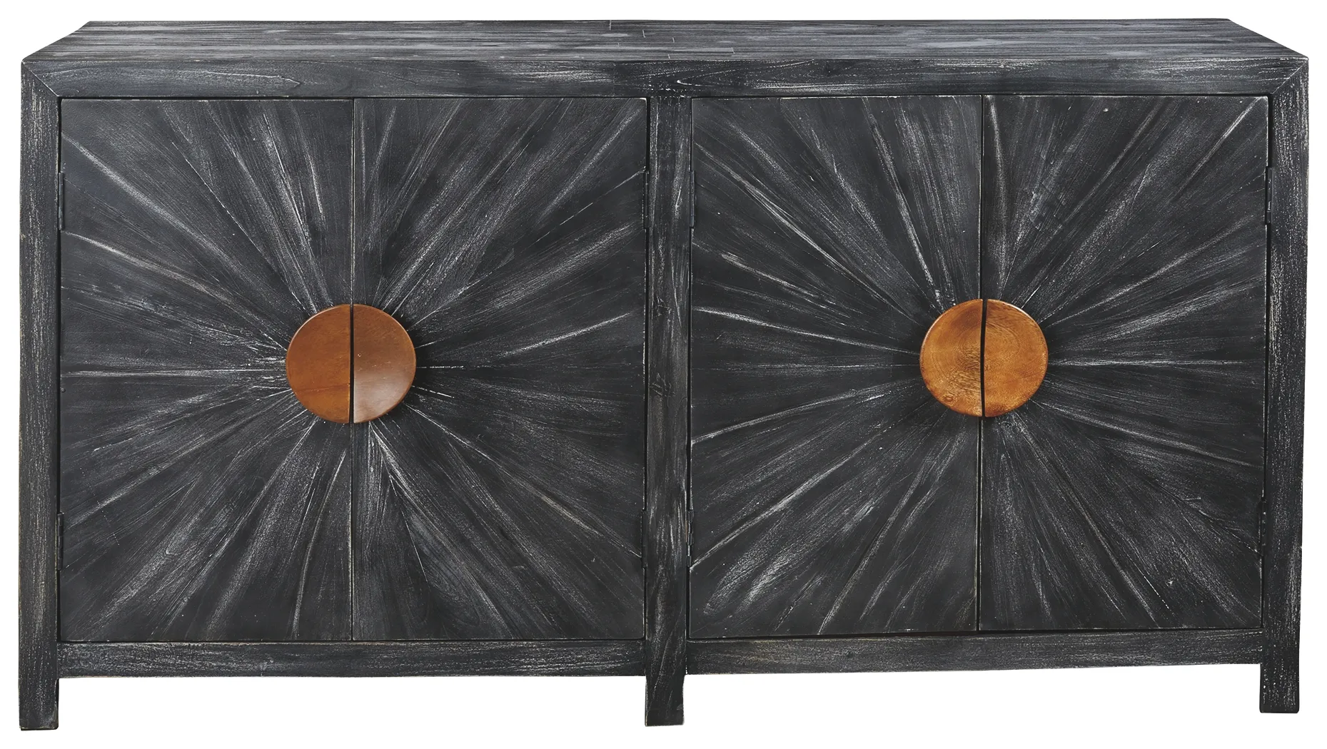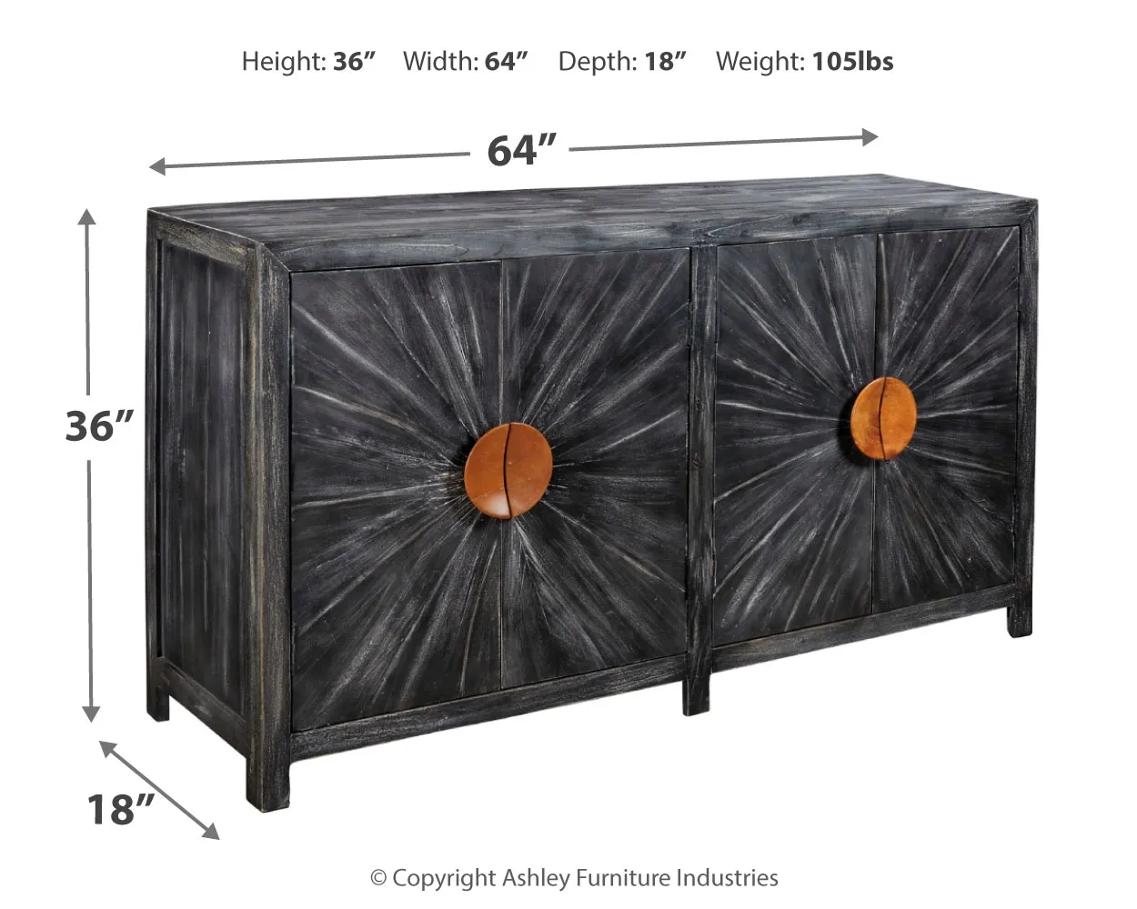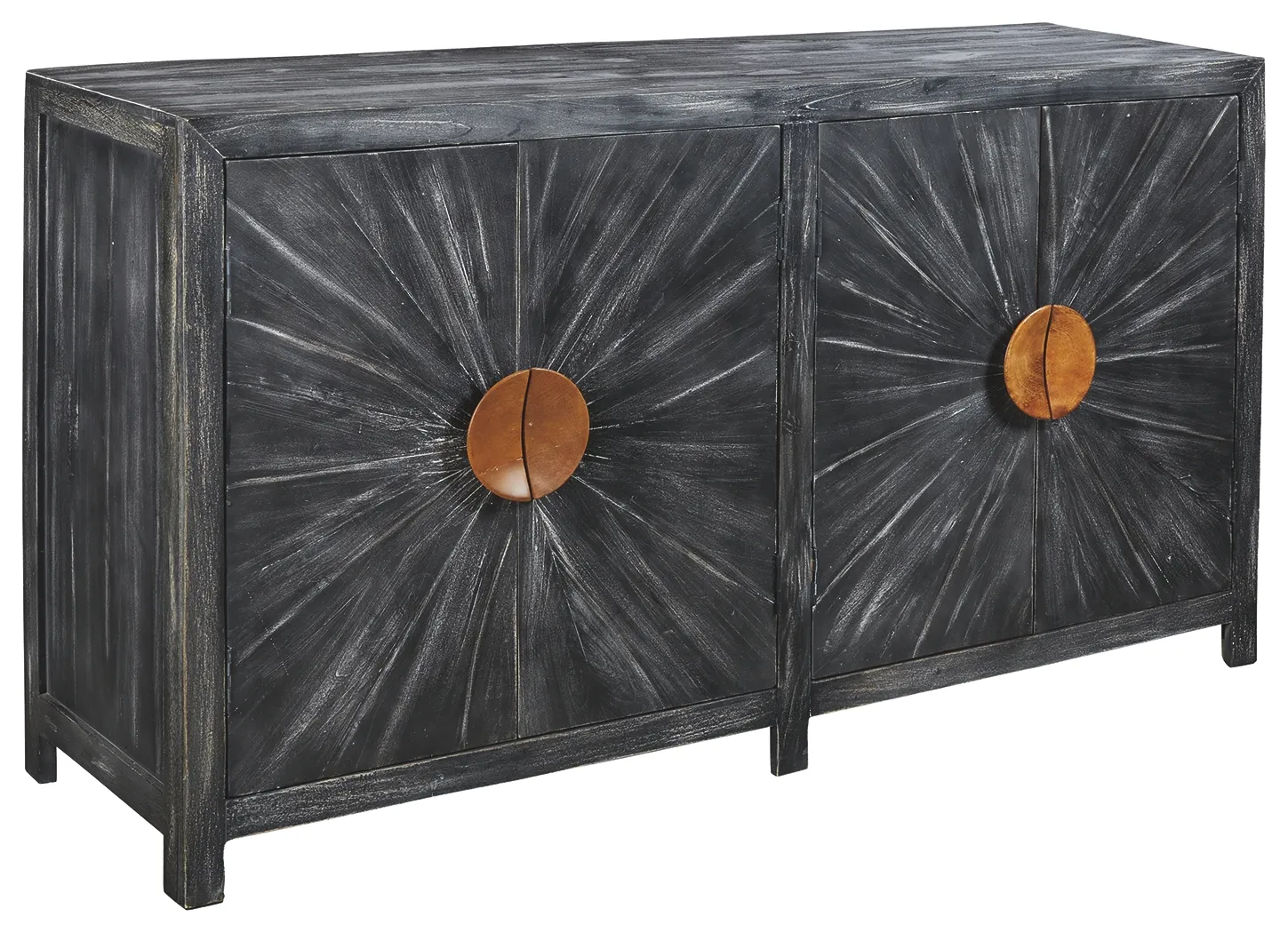 This accent cabinet flaunts style unleashed. Gorgeous wood grain permeates from the center brown door pulls for a fashion-forward look that draws you in. Antiqued black finish creates attractive contrast in your home. Stow away necessities on the interior shelves to keep your room clutter-free.