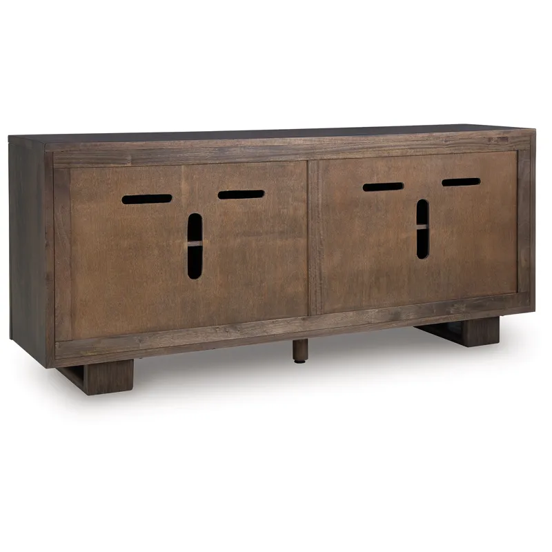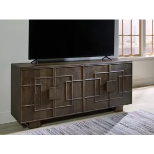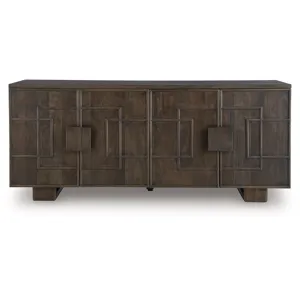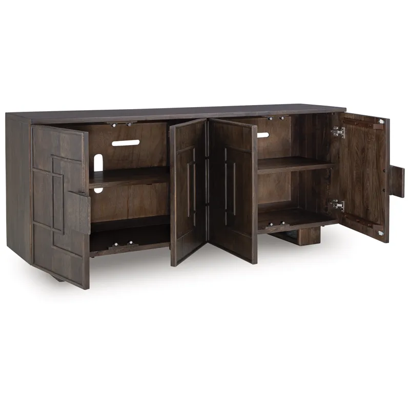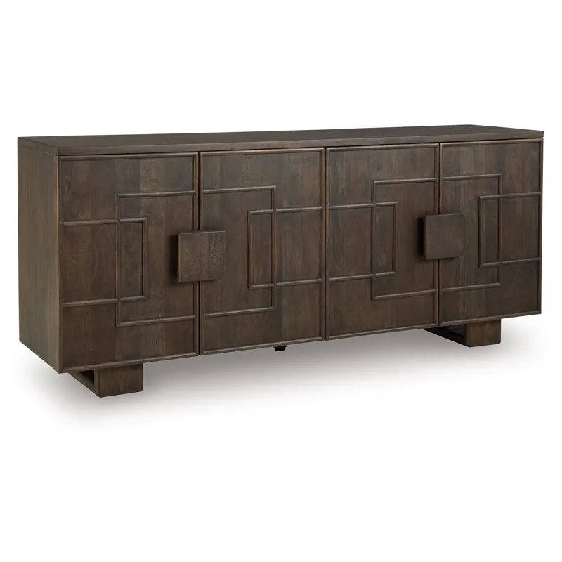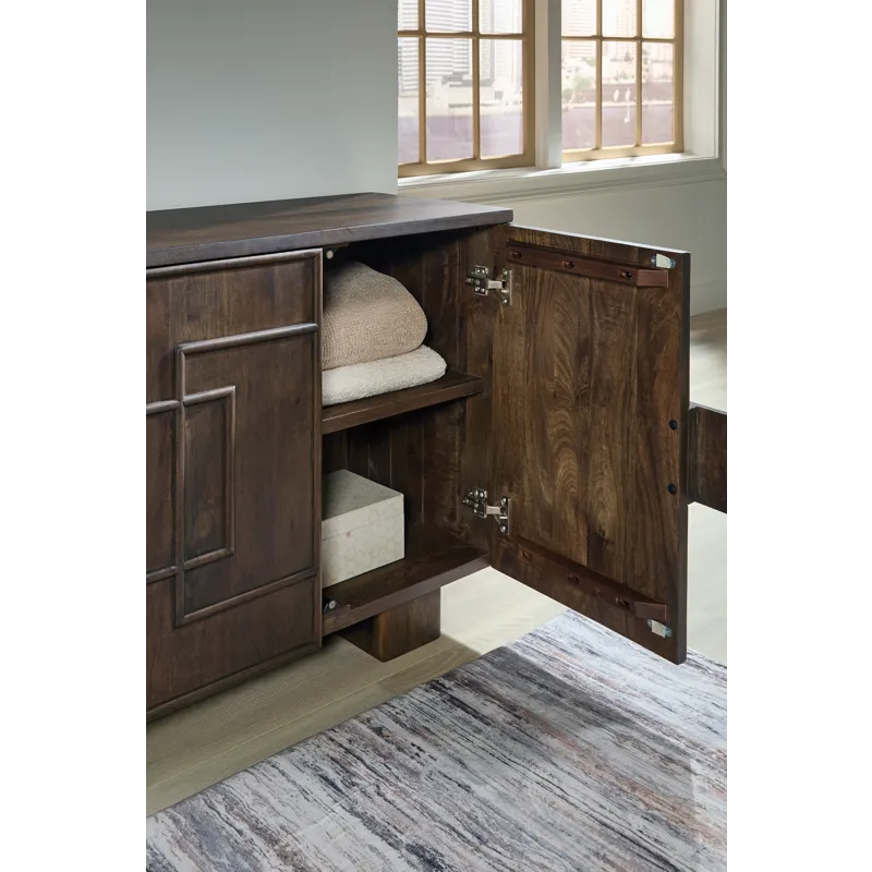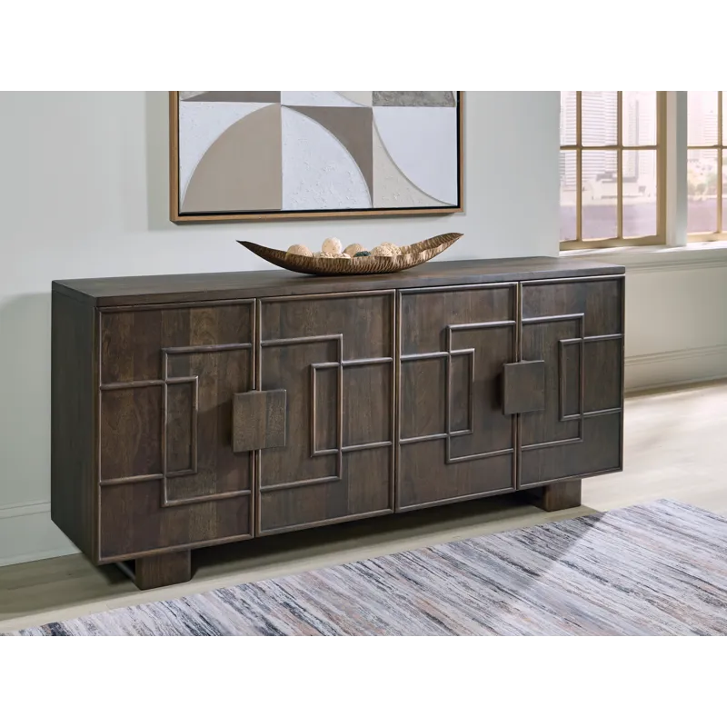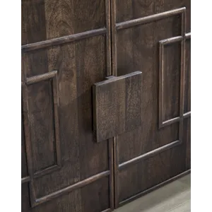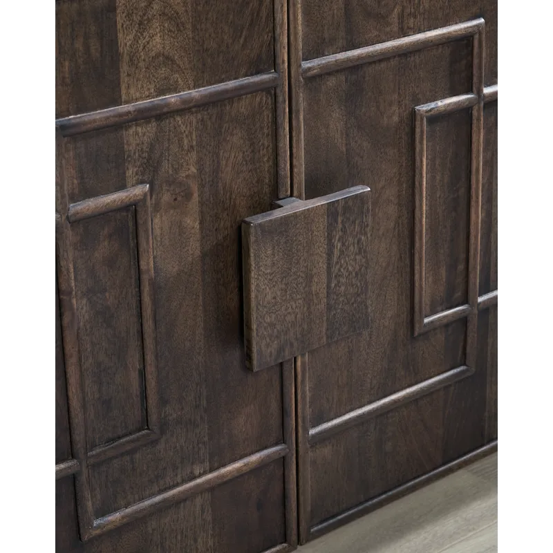 This accent cabinet is a stunning statement piece that combines artistry and functionality. A beautiful dark brown finish and raised geometric-patterned door fronts create a captivating look, while the spacious interior with two shelves offers ample storage. It's a perfect place to keep your essentials organized and out of sight.
