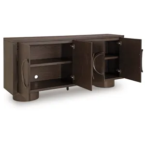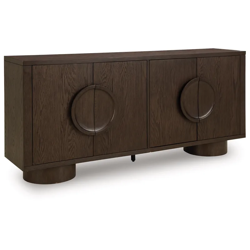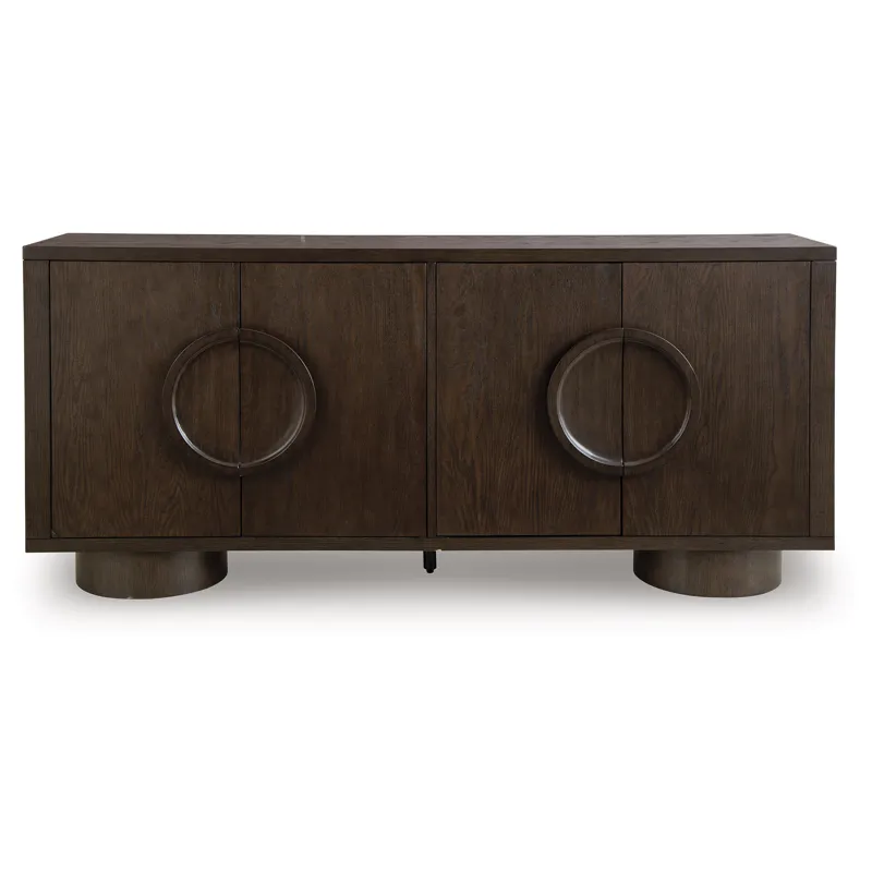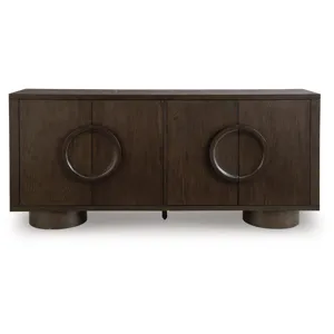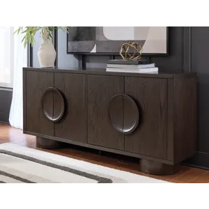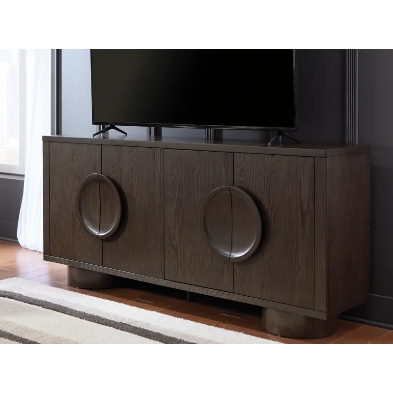 Sleek. Striking. Sculptural. This accent cabinet refines the art of functional fashion. Outfitted in a luxe dark brown finish, it’s an apt addition to contemporary entryways or dining areas. Its distinctive linear profile is beautifully contrasted by the curves of the oversized round legs and circular door pulls. Elevate your entertainment space when you stage this cabinet as a TV stand—openings in the back keep cords and cables organized for a clean, neat look.